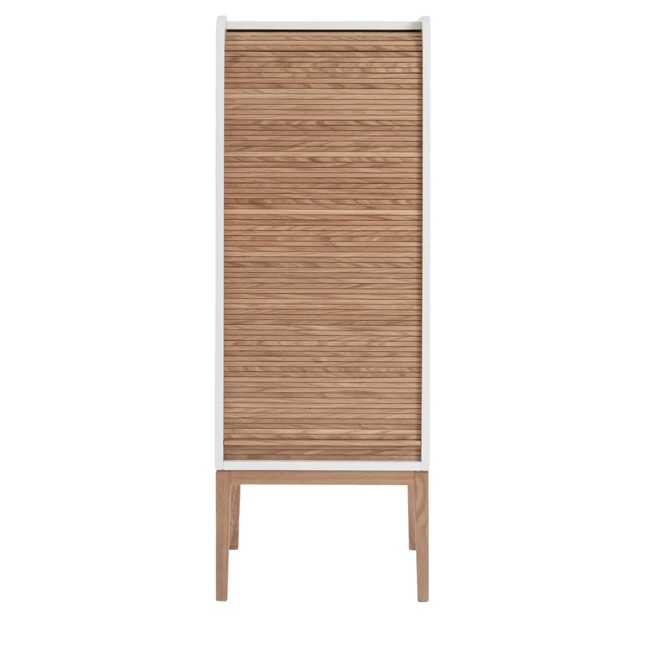 Con una silhouette rigorosa, il cui design evoca l’arredamento delle case di scrittori famosi della fine del XIX e dell’inizio del XX secolo, questo mobile è un ottimo complemento per ambienti moderni, aggiungendo un sottile calore. L’involucro laccato bianco opaco che incornicia il mobile è dotato di due ripiani in legno di quercia – regolabili in tre diverse altezze – e chiusi da una tapparella montata a mano su un telo di stoffa. Le sottili gambe che sostengono il mobile sono dotate di piedini regolabili. Per altre versioni disponibili, consultare il Concierge.