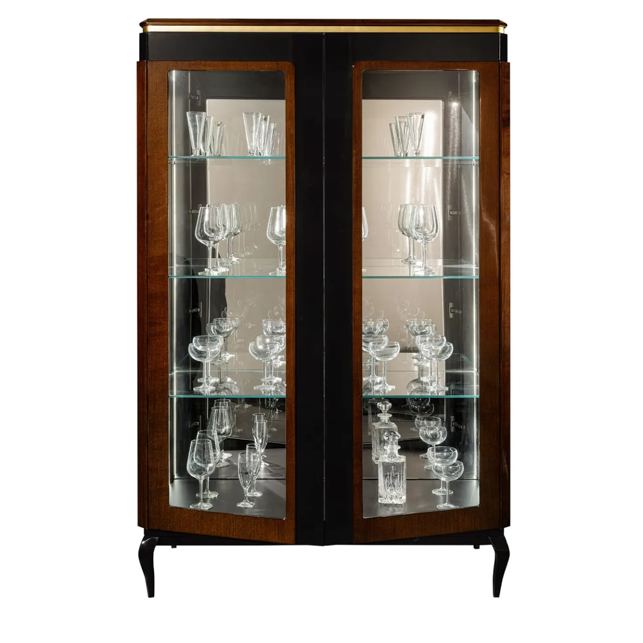 Un design audace e maestoso che sarà al centro dell’attenzione in una sala da pranzo dagli arredi sia tradizionali che moderni, questo splendido mobile si distingue per le eccezionali ante in vetro. Realizzato a mano in legno di frassino impiallacciato e arricchito da un profilo metallico, è rifinito con una tonalità Moka imperador. Disponibile anche in finitura sabbia avorio, si prega di consultare il Concierge per ulteriori dettagli. I bicchieri non sono inclusi.