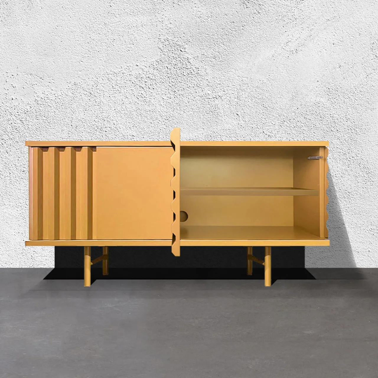 B-SIDE è un elegante contenitore per spazi abitativi, ispirato alla semplicità dei container. Realizzata in MDF ecosostenibile con finitura opaca industriale, i suoi pannelli frontali ondulati creano un gioco unico di luci e ombre. Disponibile in tre dimensioni, questa credenza presenta un design minimalista che reinterpreta le forme classiche dei mobili. Le opzioni di personalizzazione includono l’illuminazione interna, le finiture in MDF e una scelta di oltre 130 colori selezionati dal designer.