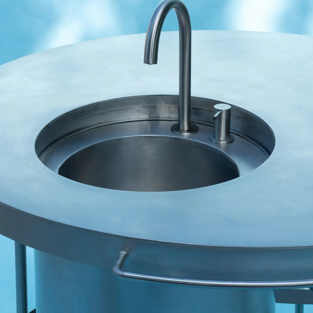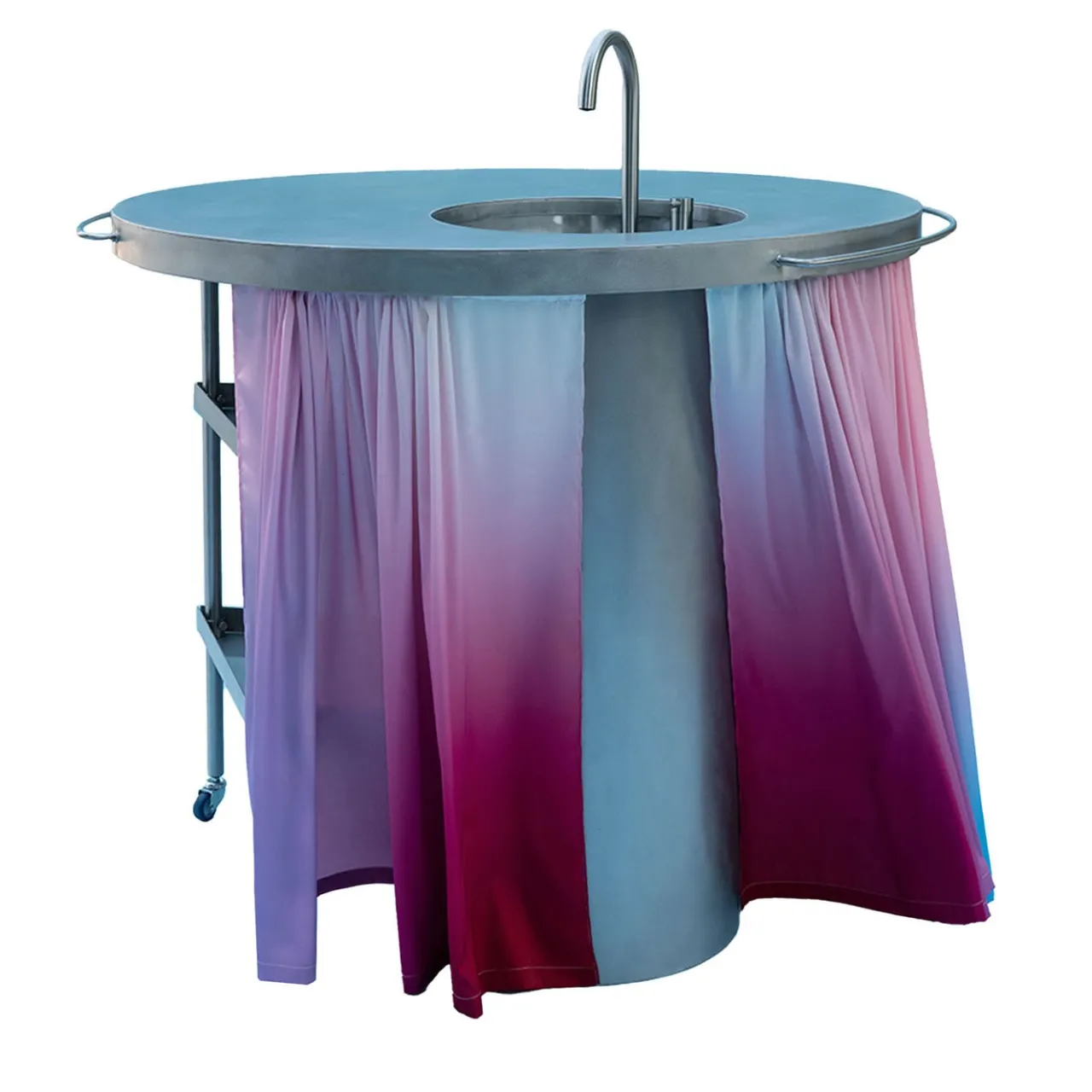 Ecco Ballerina della designer Federica Zama, un’isola da cucina rivoluzionaria che trasforma la cucina in un’esperienza gioiosa. È dotata di un piano in acciaio inossidabile, di ripiani triangolari regolabili e di un lavello cilindrico saldato a mano. Il suo design mobile consente di spostarla facilmente all’interno o all’esterno. Una guida nascosta consente di personalizzare l’aspetto con tende realizzate con tessuti riciclati. Disponibile in varie dimensioni, con possibilità di lavello e piano cottura a induzione. Il rubinetto non è incluso.