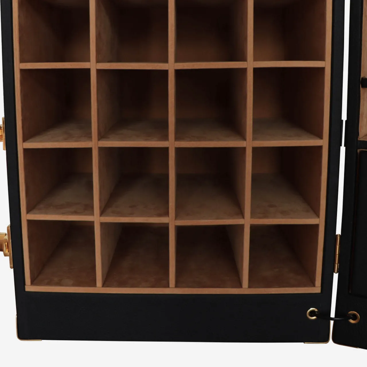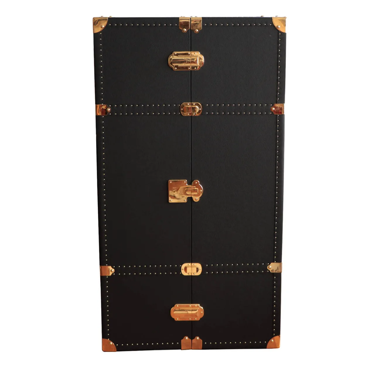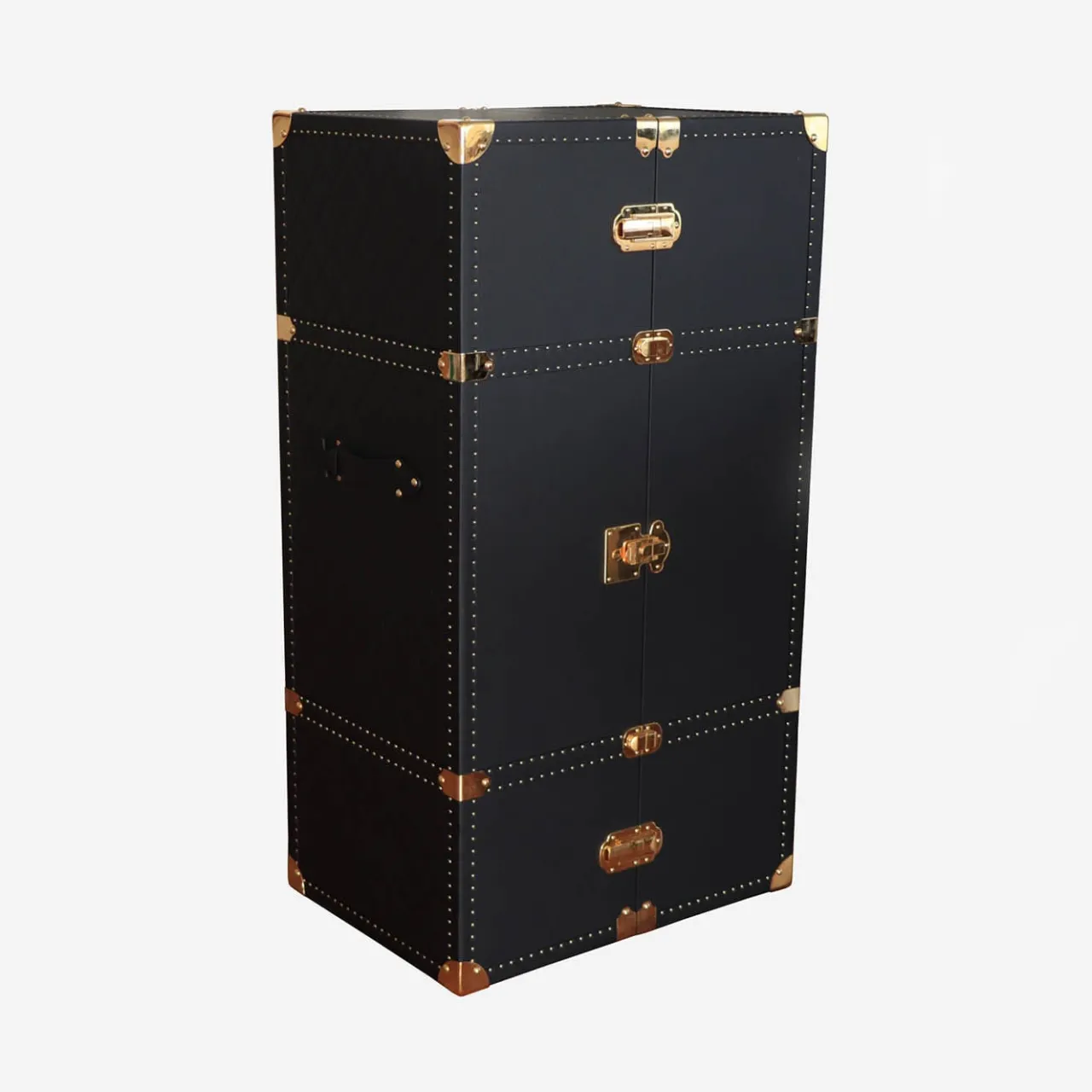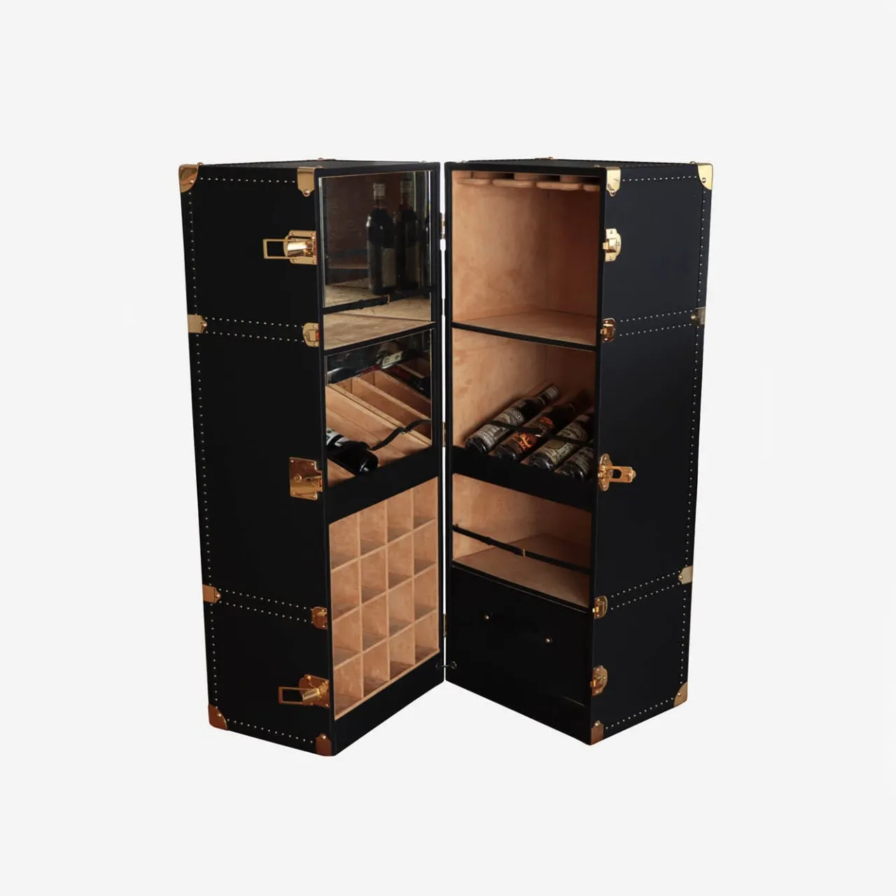Questo baule da bar con ruote, che sembra provenire da una parte gloriosa, è un regalo perfetto per gli aficionados. Realizzato a mano in legno e rivestito in vera pelle nera, sfoggia un’opulenta ferramenta dorata che include una serratura a chiave e borchie all’esterno, mentre un sofisticato sistema di illuminazione equipaggia l’interno. Un lato specchiato offre tre diversi tipi di portabottiglie e l’altro uno scomparto per bicchieri a stelo, un portaoggetti e un altro portabottiglie. La presa di corrente è inclusa.
