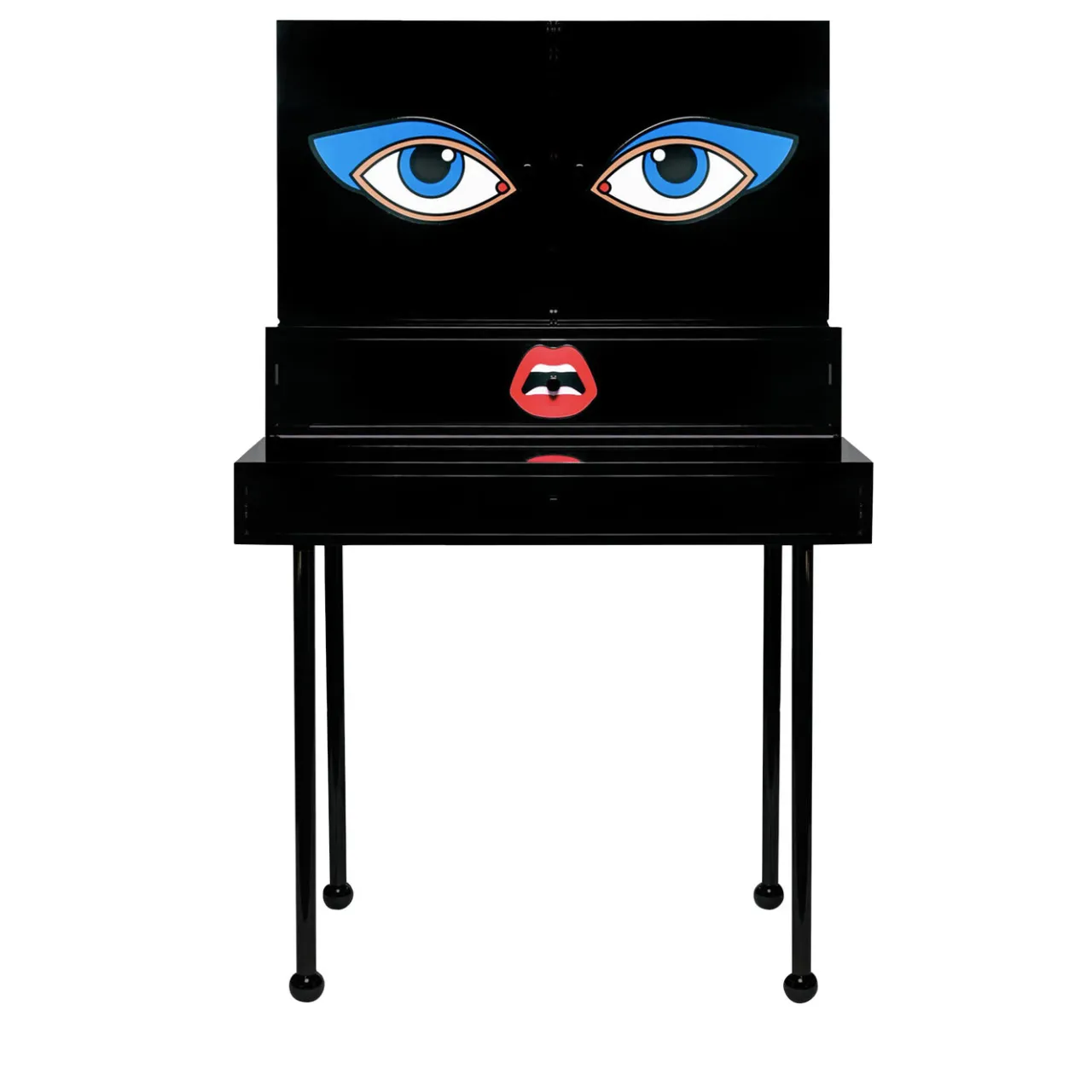Questo scrittoio di tendenza della collezione Home Sweet Home è il complemento perfetto per un arredamento moderno e femminile della camera da letto. Il design seducente celebra l’iconica star del cinema americano, famosa per i suoi occhi espressivi. La struttura lineare in alluminio poggia su sottili gambe cilindriche con ghiere a forma di sfera ed è completata dalla scenografica finitura nera, accentuata da labbra sensuali e occhi seducenti sul cassetto anteriore e sulle ante del mobile. Il mobile è dotato di un pannello posteriore a specchio e di specchi a forma di cuore all’interno delle due ante che creano uno stile glamour e retrò.