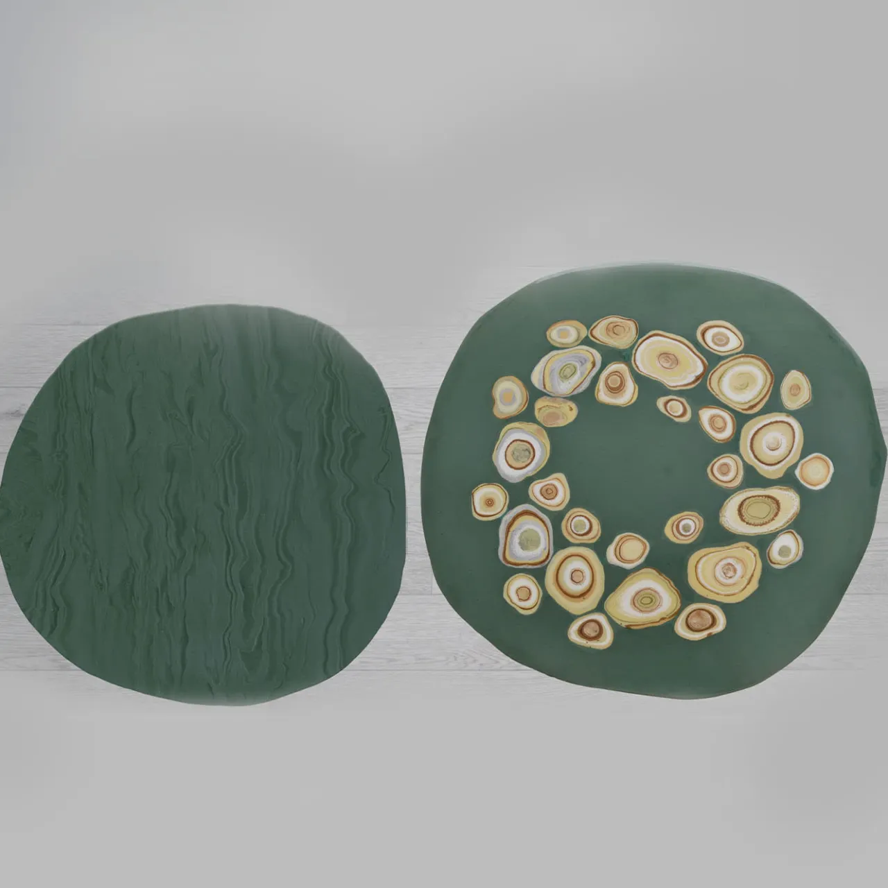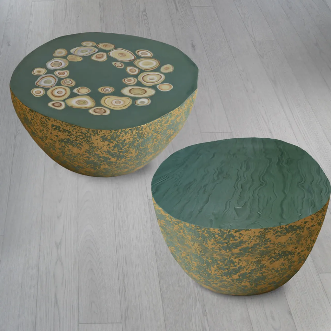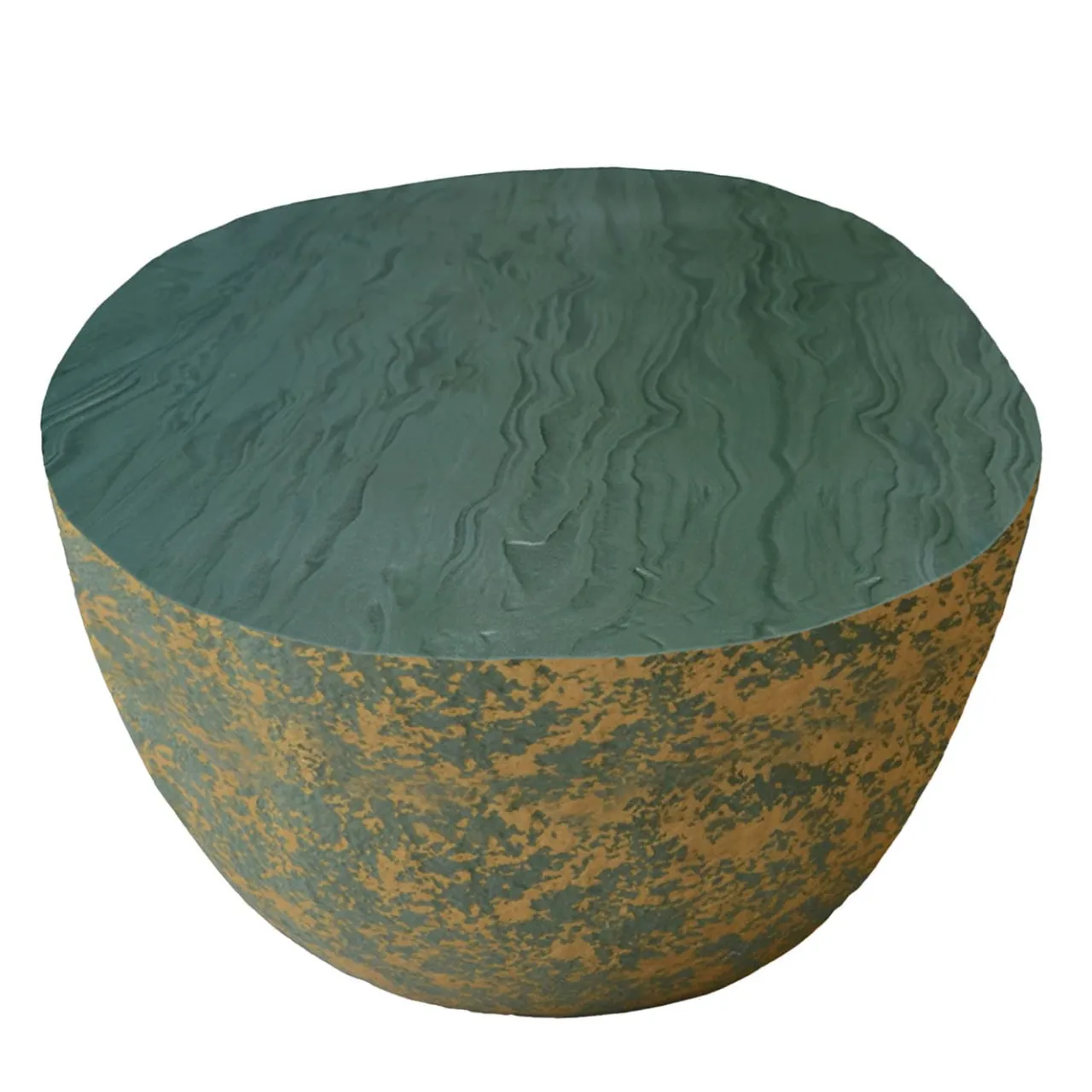 Caratterizzato da profili sottilmente irregolari che rivelano una chiara ispirazione naturale, questo tavolino della collezione BonBon cattura immediatamente lo sguardo con la sua silhouette audace e colorata. Accattivanti dettagli materici arricchiscono il piano e i fianchi in tonalità verde, tono che caratterizza anche i lati ma interrotto da un sofisticato disegno dorato. Abilmente realizzato a mano, ogni pezzo è unico.