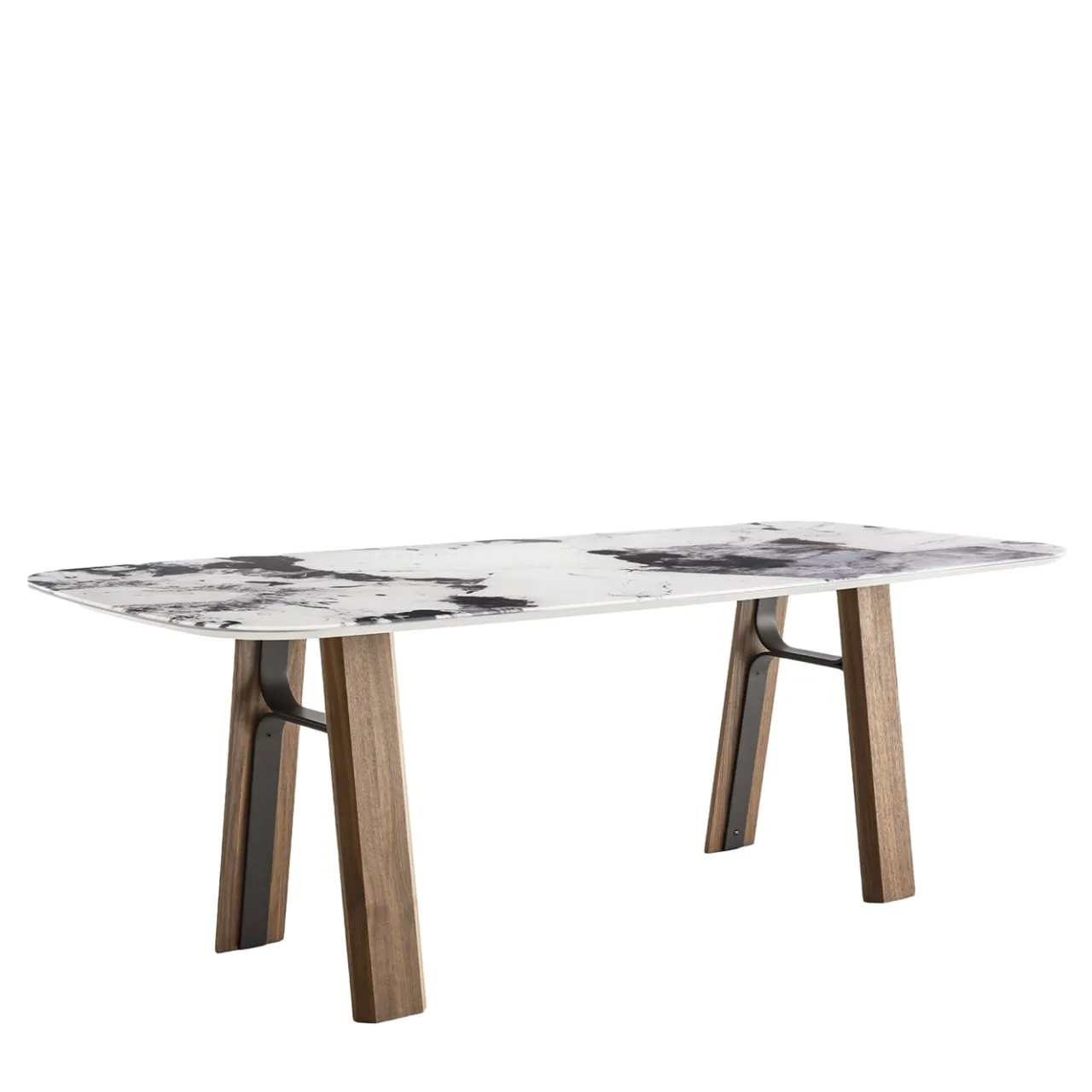 Un’attenzione minuziosa ai dettagli, mutuata dall’alta moda, contraddistingue questo sofisticato tavolo da pranzo. Caratterizzato da audaci gambe in noce canaletto, si distingue per la minuta stampa effetto marmo Patagonia impressa sul piano in vetro temperato, che sovrasta un pannello in MDF laccato smussato a mano (60°). Travi metalliche curve e brunite, verniciate con polveri epossidiche, rafforzano il design.