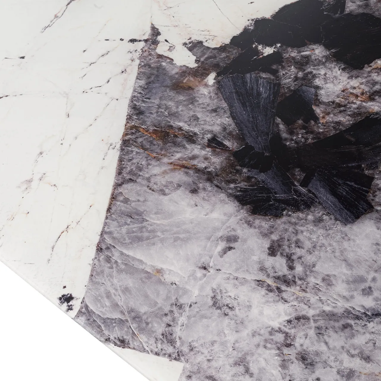 Il marmo Patagonia, con i suoi stupefacenti accenti grafici, è stato scelto per la stampa fedele che questo tavolo presenta sul suo piano in vetro temperato extrachiaro. Sostenuto da audaci gambe in MDF impiallacciate in rovere Laguna e rinforzato da travi metalliche curve – verniciate con polveri epossidiche color champagne – il piano presenta anche un pannello in MDF laccato e smussato a mano su cui aderisce il vetro.