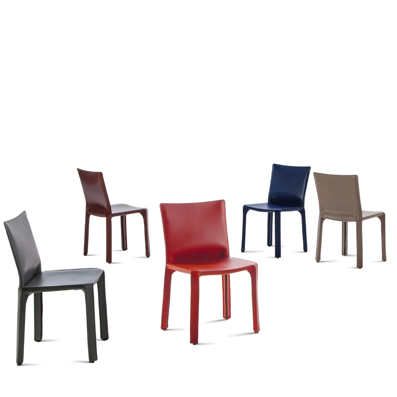 Cab 412 – Sedia in cuoio sellato (rivestimento cod. 1T). “Si trattava di un nuovo tipo di sedia, costruita totalmente in cuoio, molto clonata da allora”: così Mario Bellini descrive Cab, un best-seller da lui disegnato negli anni Settanta, oggi pezzo forte della collezione I Contemporanei di Cassina. Cab è stata la prima sedia in assoluto a presentare una struttura in pelle indipendente, ispirata al modo in cui la nostra pelle si adatta al nostro scheletro. Il rivestimento è costituito da sedici pezzi di pelle di sella. Sono sottoposti a quattordici procedure discrete, sempre a mano. I pezzi vengono cuciti insieme solo dopo che i loro bordi esterni sono stati rifilati per garantire una perfetta aderenza. Una volta assemblato, il rivestimento viene fissato allo scheletro d’acciaio della sedia e mantenuto in posizione mediante una chiusura lampo, come in un abito sartoriale su misura. Oggi questo modello si adatta e si espande per soddisfare le esigenze contemporanee. È ora disponibile un modello XL, più profondo di 5 cm, e una versione Baby, realizzata con la stessa cura artigianale. Sono disponibili anche le nuove pelli da sella Plus in pura anilina e alcune versioni con effetto sfumato realizzato a mano su base naturale.