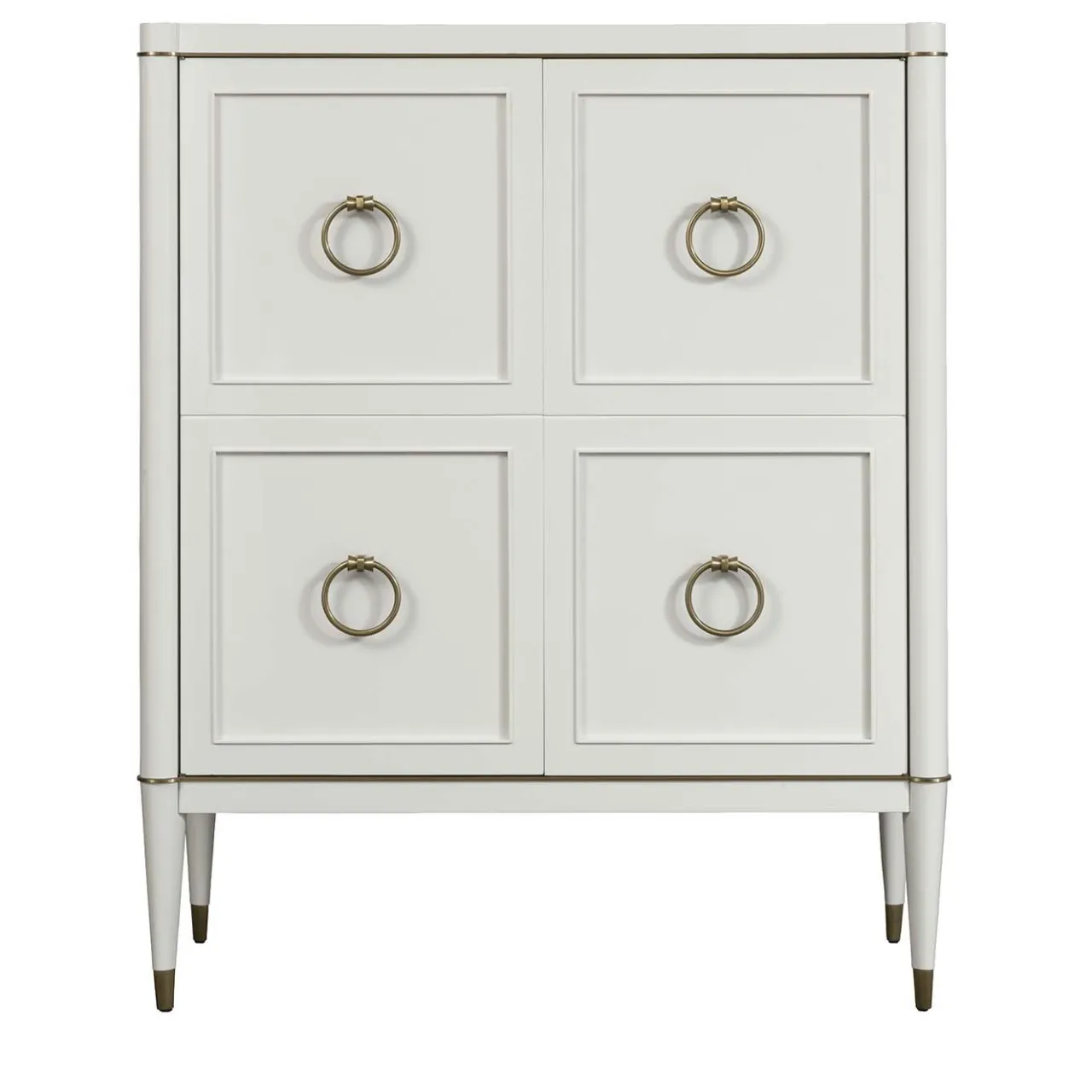 Parte della collezione Ambra, questo mobile bianco è una splendida aggiunta a un arredamento sia classico che moderno. Combinando l’artigianato e i materiali tradizionali con un design lineare e colori vivaci, questo mobile è uno spazio di archiviazione versatile e senza tempo per ogni stanza della casa. La struttura in legno massiccio è impreziosita da una finitura satinata in ottone lungo il perimetro, sui piedi e sulle maniglie. Le ante anteriori vantano una superficie laccata, mentre l’interno è rivestito in ecopelle per un effetto lussuoso. L’accento metallico può avere anche una finitura bronzata.