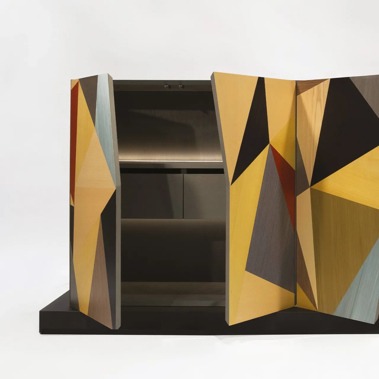La credenza totemica Enna, ispirata all’arte moderna e contemporanea della Sicilia, può essere collocata ovunque grazie ai suoi cinque lati a vista. L’intarsio in legno policromo, con il suo design minimalista, richiama sia le avanguardie del primo Novecento sia il linguaggio decorativo del radical design dei primi anni Ottanta. L’interno è rifinito con vernice grigia a poro aperto, mentre i pannelli laterali e posteriori sono realizzati in legno di quercia con finitura all’acqua. Illuminazione incorporata inclusa.