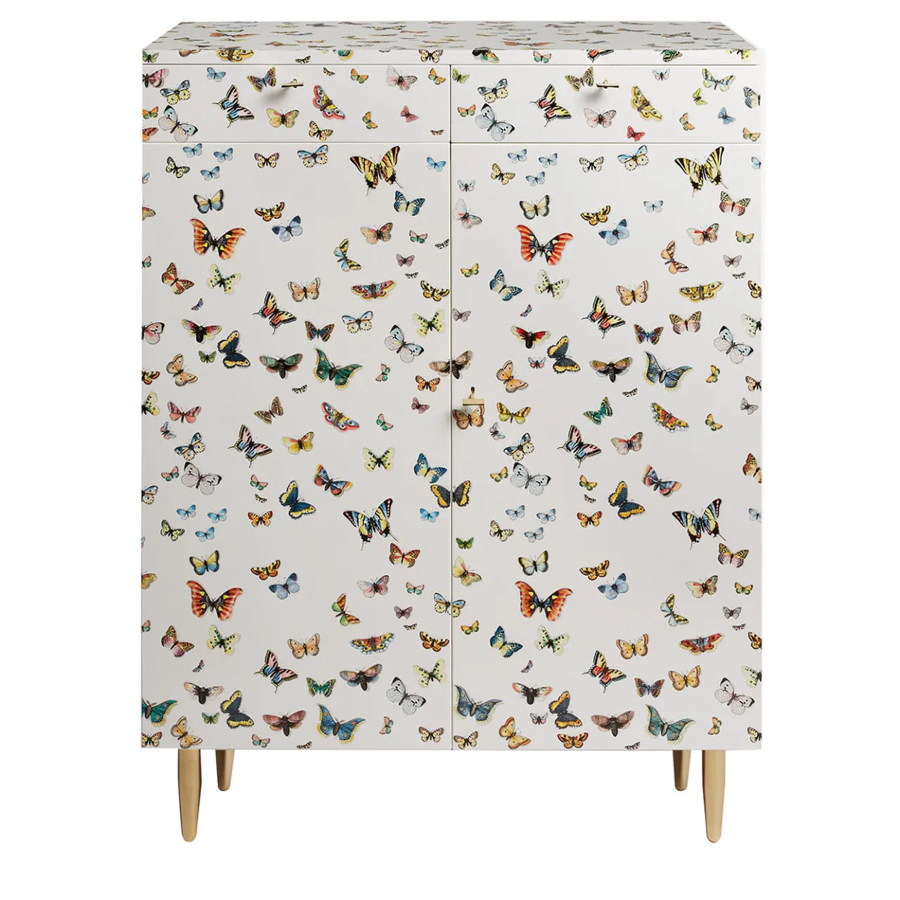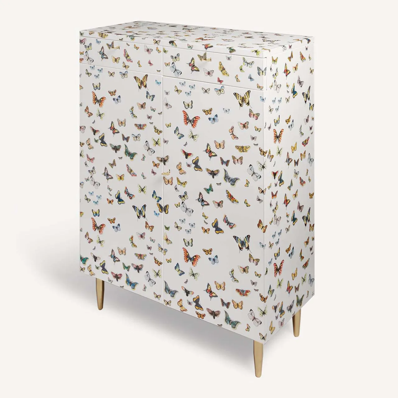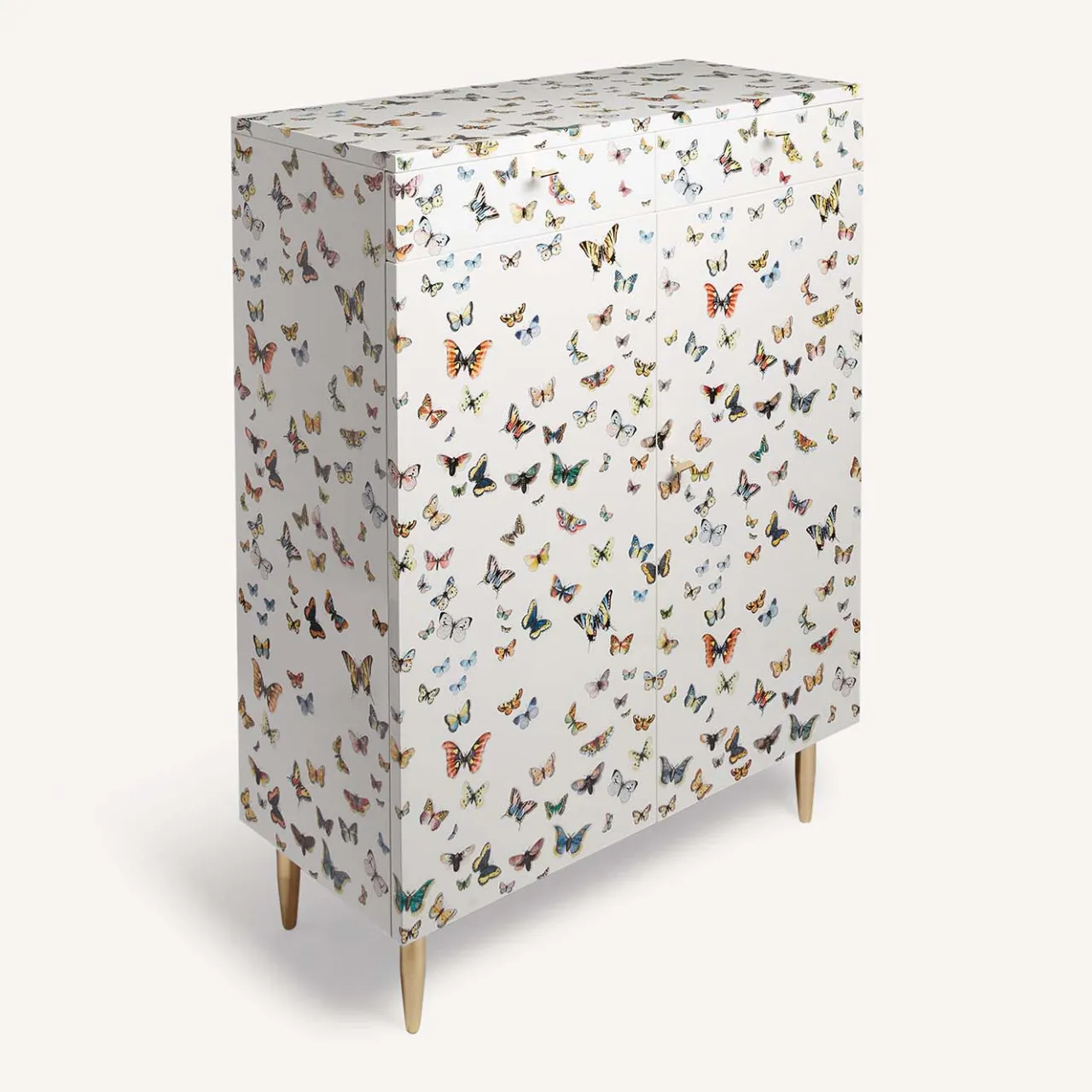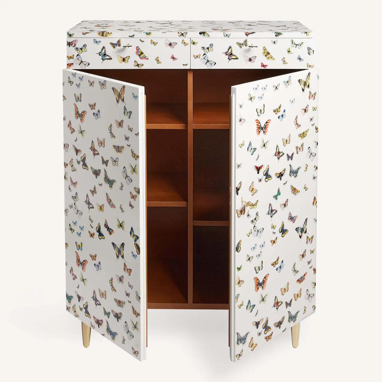Un grazioso stormo di farfalle si staglia sullo sfondo bianco di questo mobile, che sembra quasi trasportarlo verso il cielo con la forza dell’immaginazione. Serigrafato, dipinto e laccato a mano, il mobile è dotato di gambe in ottone massiccio, due cassetti e due comode ante a battente. Eventuali piccole differenze tra creazioni simili sono il risultato della lavorazione artigianale e testimoniano l’unicità di ogni prodotto.