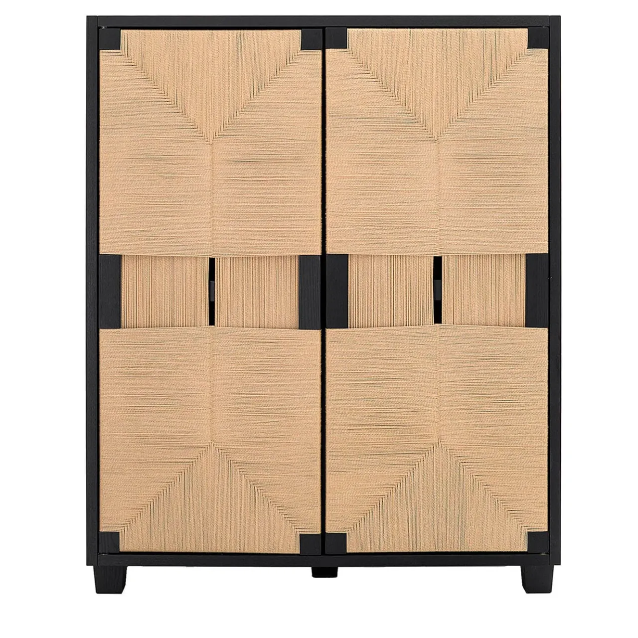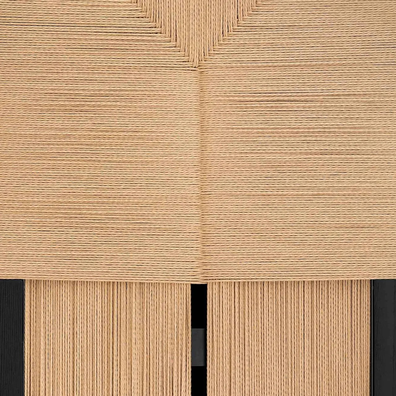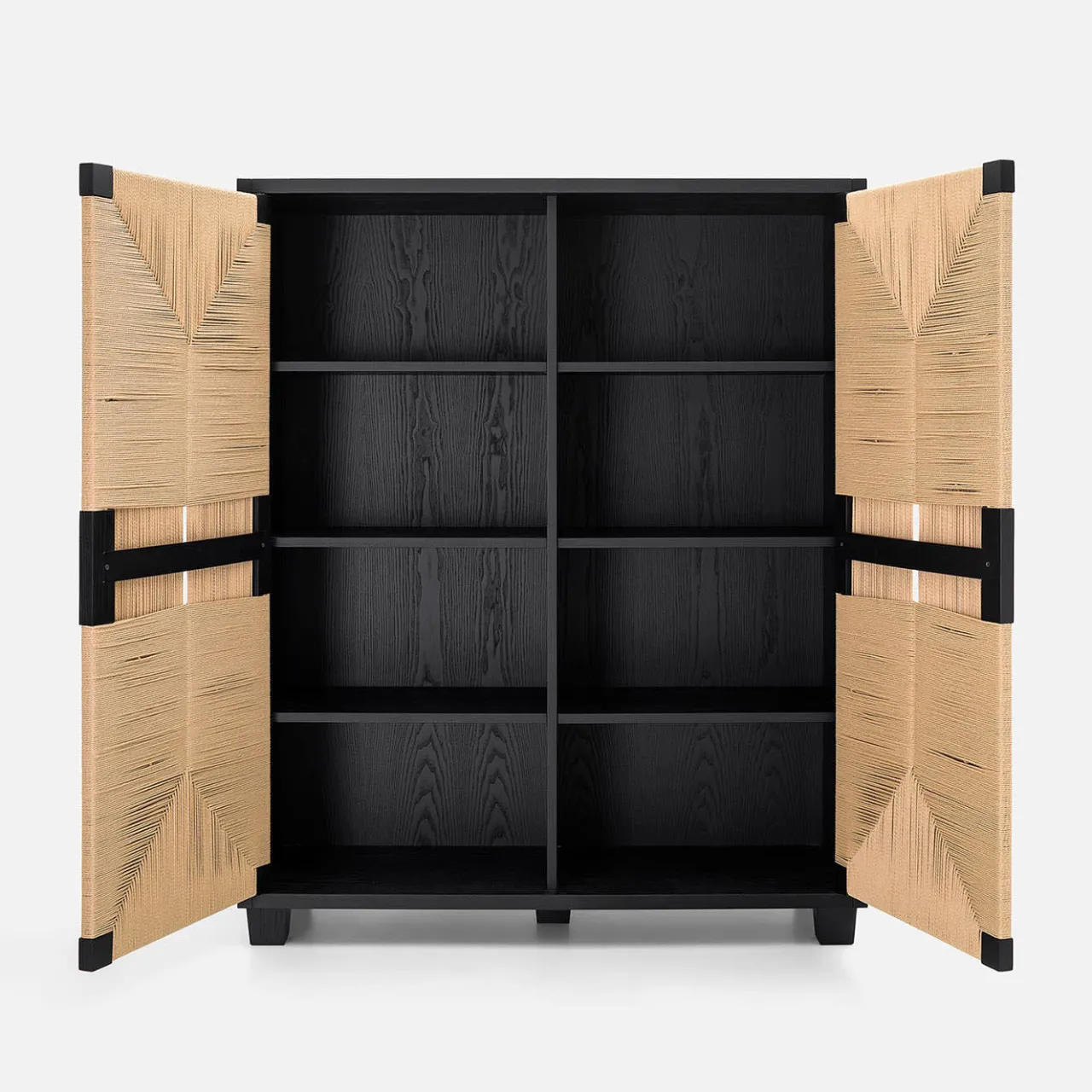 L’armadio Himba, una scatola di frassino massiccio tinto di nero con ripiani incorporati, ha ante di chiusura composte da un telaio di frassino e corda intrecciata. L’intreccio è tradizionalmente disegnato su un telaio ortogonale, tranne che nella parte centrale, dove un disegno più leggero di tessitura realizzato con un unico filo rende visibile la direzione verticale dell’ordito. Disponibile anche in frassino naturale, tinto noce e con intreccio in corda nera.