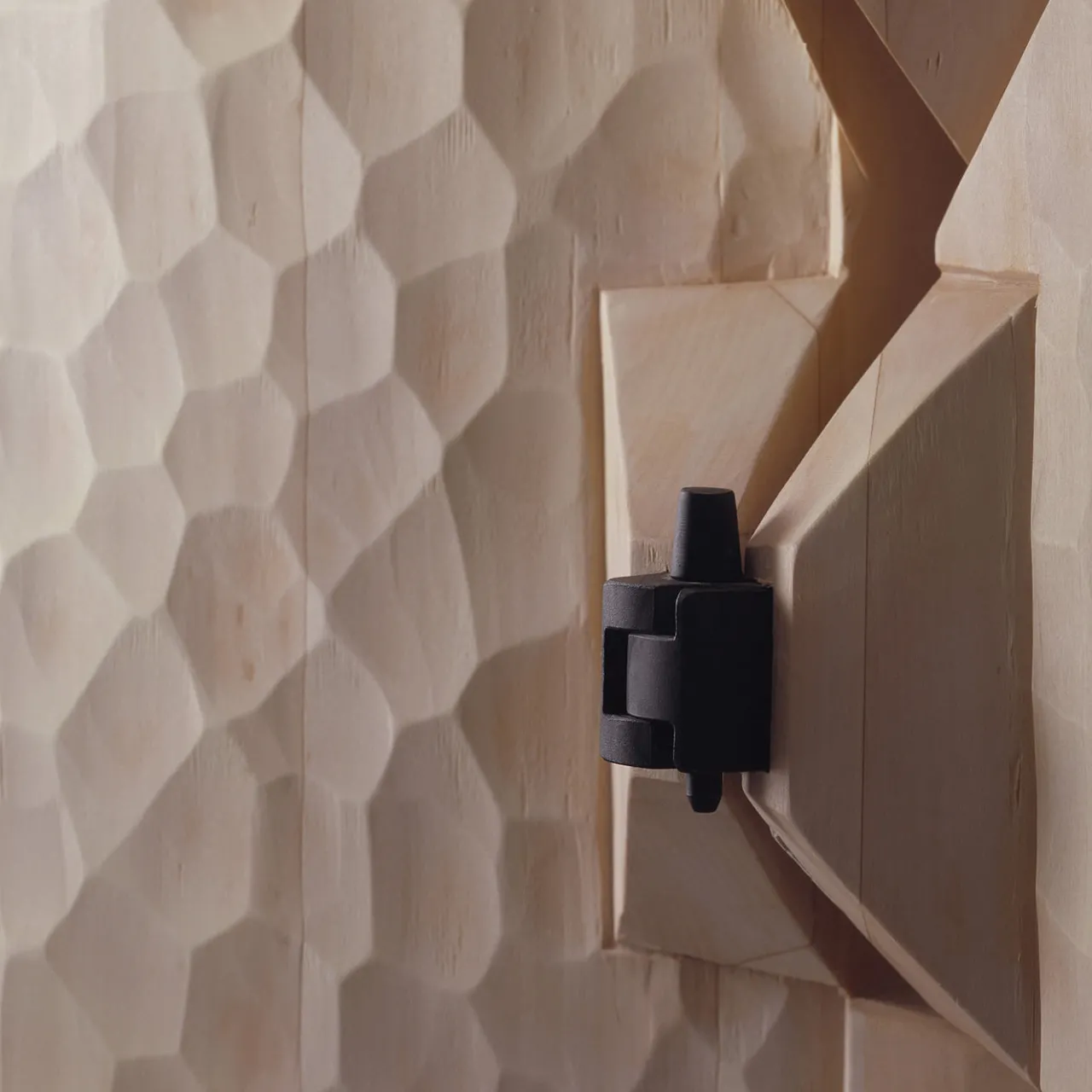 Contenitore monolitico a quattro ante, costruito con fibra verticale. Superfici intagliate con una sgorbia. Cerniere a vista sul retro in acciaio brunito.