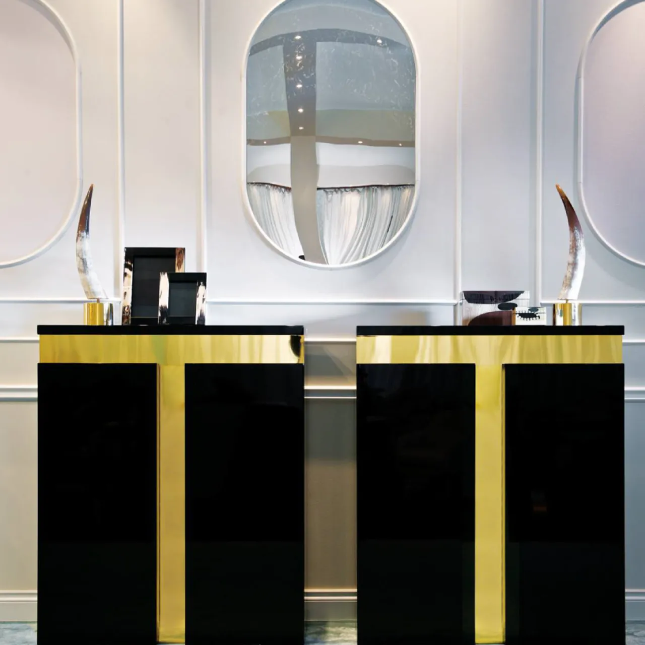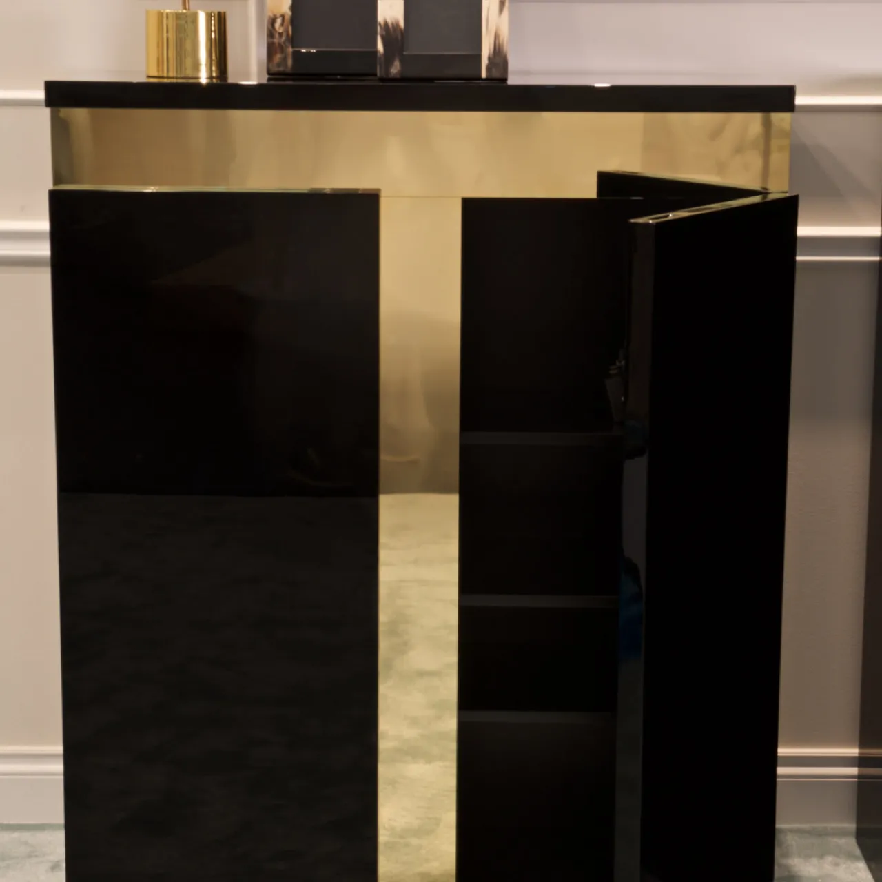 Elegante oggetto d’arredo funzionale per un interno moderno, questo mobile vanta un design ispirato all’audacia dell’Art Déco e al minimalismo contemporaneo. La silhouette lineare è sottolineata da elementi in metallo ottonato lucido che contrastano con la superficie laccata nera lucida del pezzo e segnano la presenza di due ante frontali che si aprono in uno spazio interno diviso da tre ripiani.