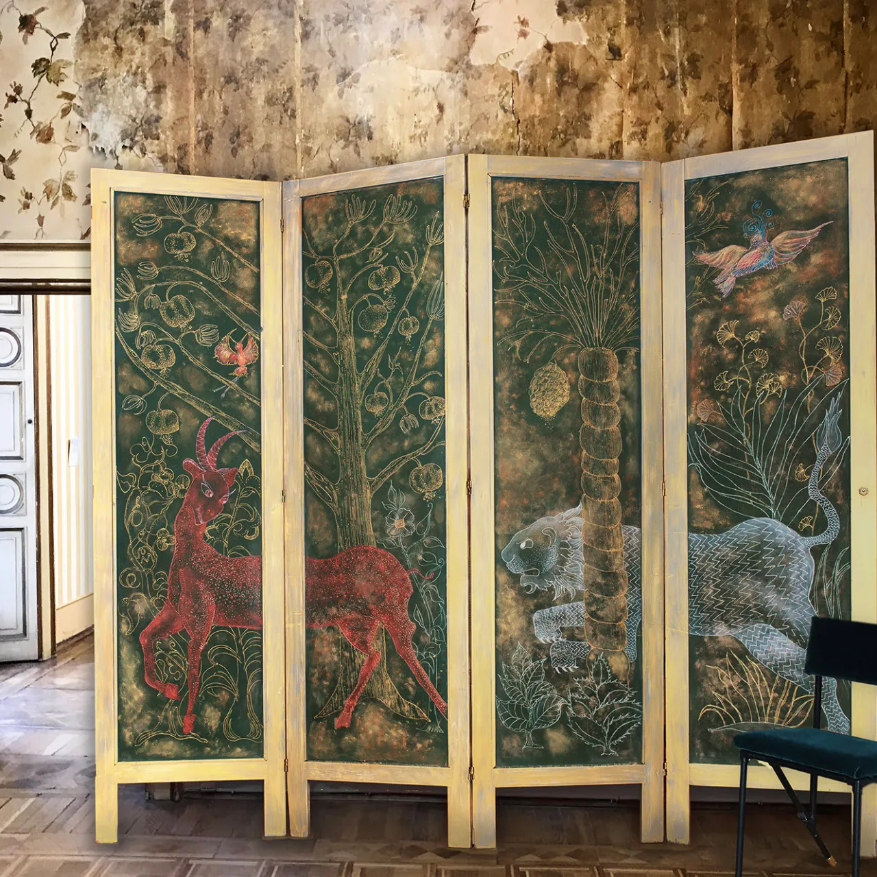 Splendida decorazione per ogni ambiente, questo incantevole paravento a 4 pannelli si ispira ai mosaici del primo periodo bizantino. Dipinto a mano su un paravento restaurato, le tele conservate sono incorniciate in legno con finitura oro opaco e dipinte a mano con un effetto a rilievo nei colori oro, argento, rame e blu metallizzato. La classica scena di caccia presenta un leone rampante che insegue una capra in una foresta dorata, piena di alberi di melograno, pini con pigne e un ginkgo dorato le cui foglie sono realizzate in parte con pizzi d’epoca.