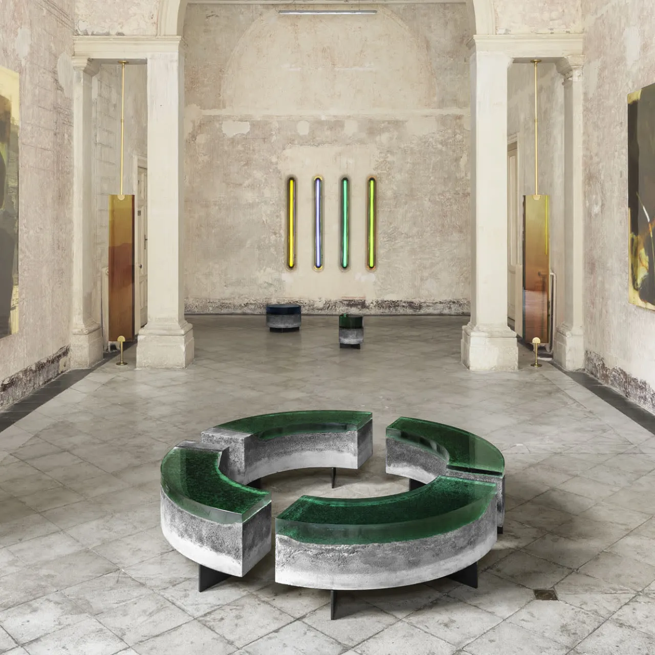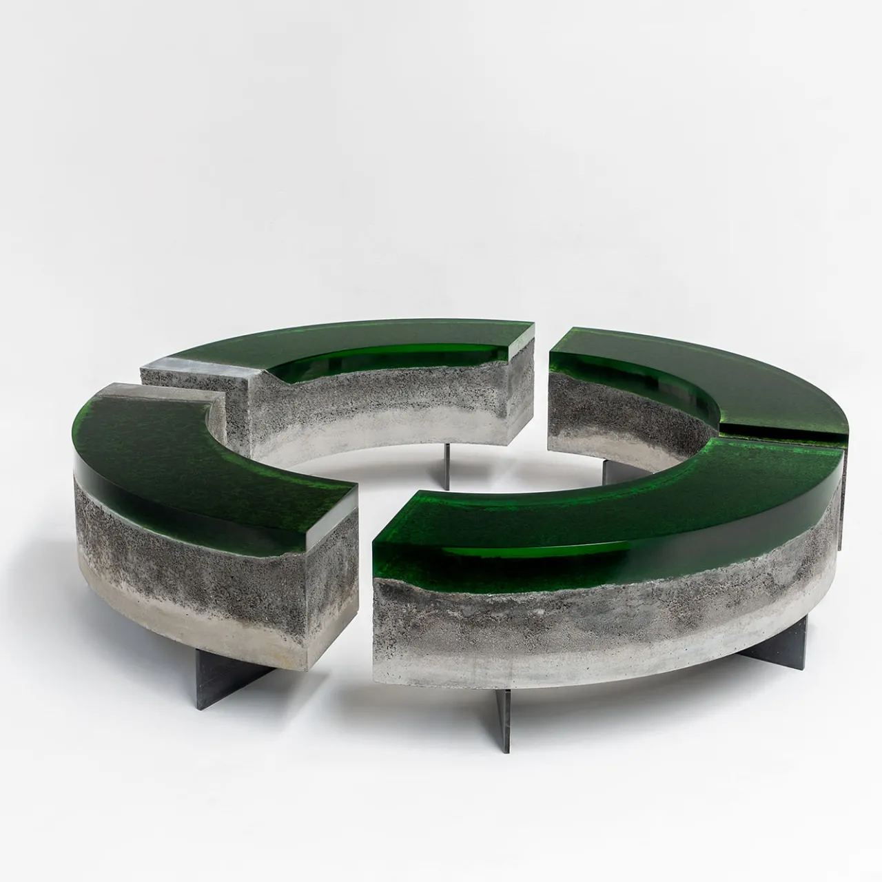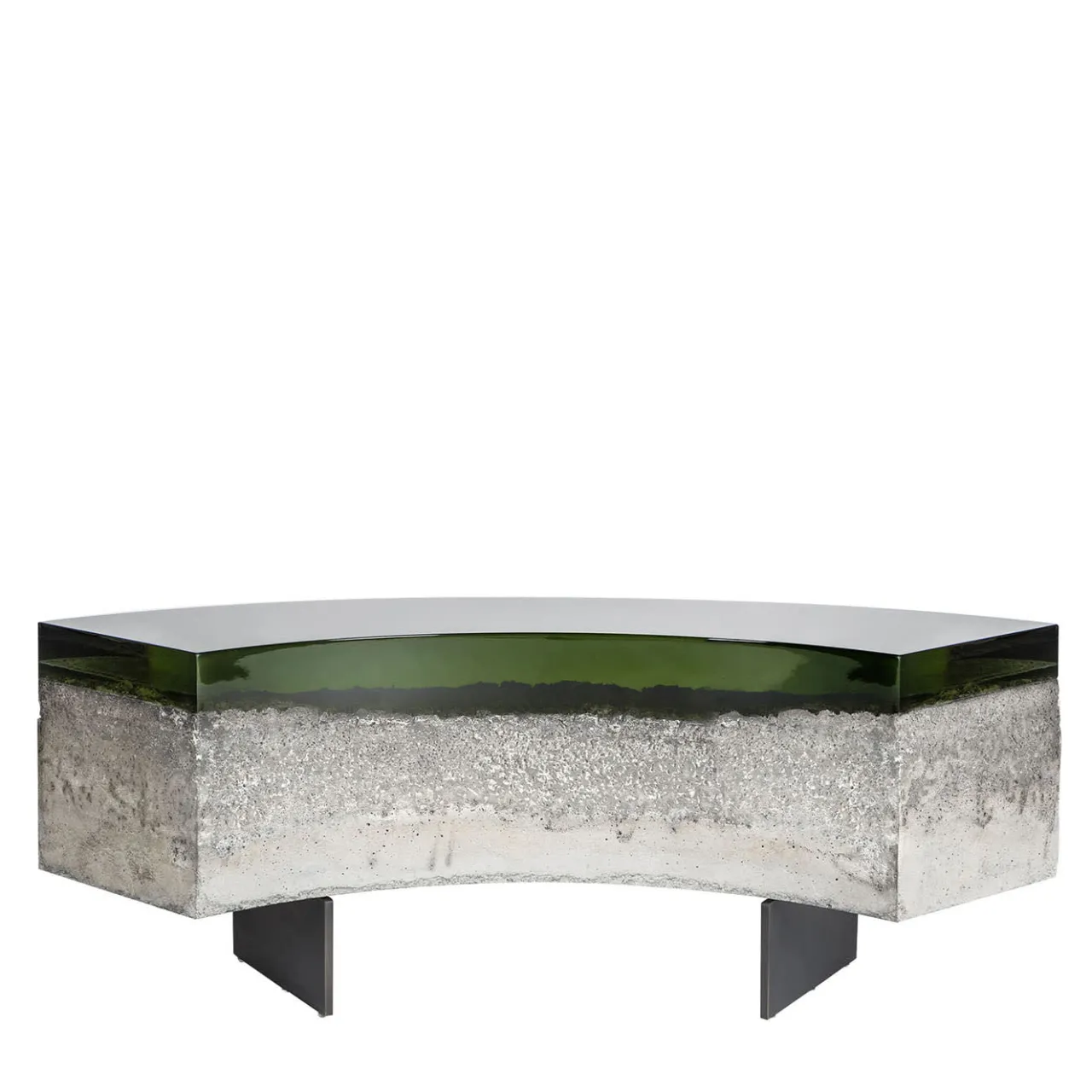 Evoluzione degli omonimi tavolini, la panca Cala è composta da una base in cemento grezzo ricoperta da uno spesso strato di resina epossidica, che rimanda al paesaggio lacustre del lago di Como. Colata in più strati per ricreare un piano profondo e mutevole che evoca la superficie dell’acqua, la resina sembra rivelare il fondo del lago sottostante, mentre la composizione dalle forme arrotondate richiama le rive levigate dall’acqua. Il set completo si compone di quattro pezzi che possono essere posizionati in cerchio o invertiti e alternati per creare layout dinamici. Disponibile in altri colori.
