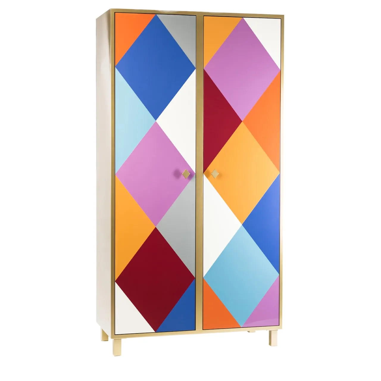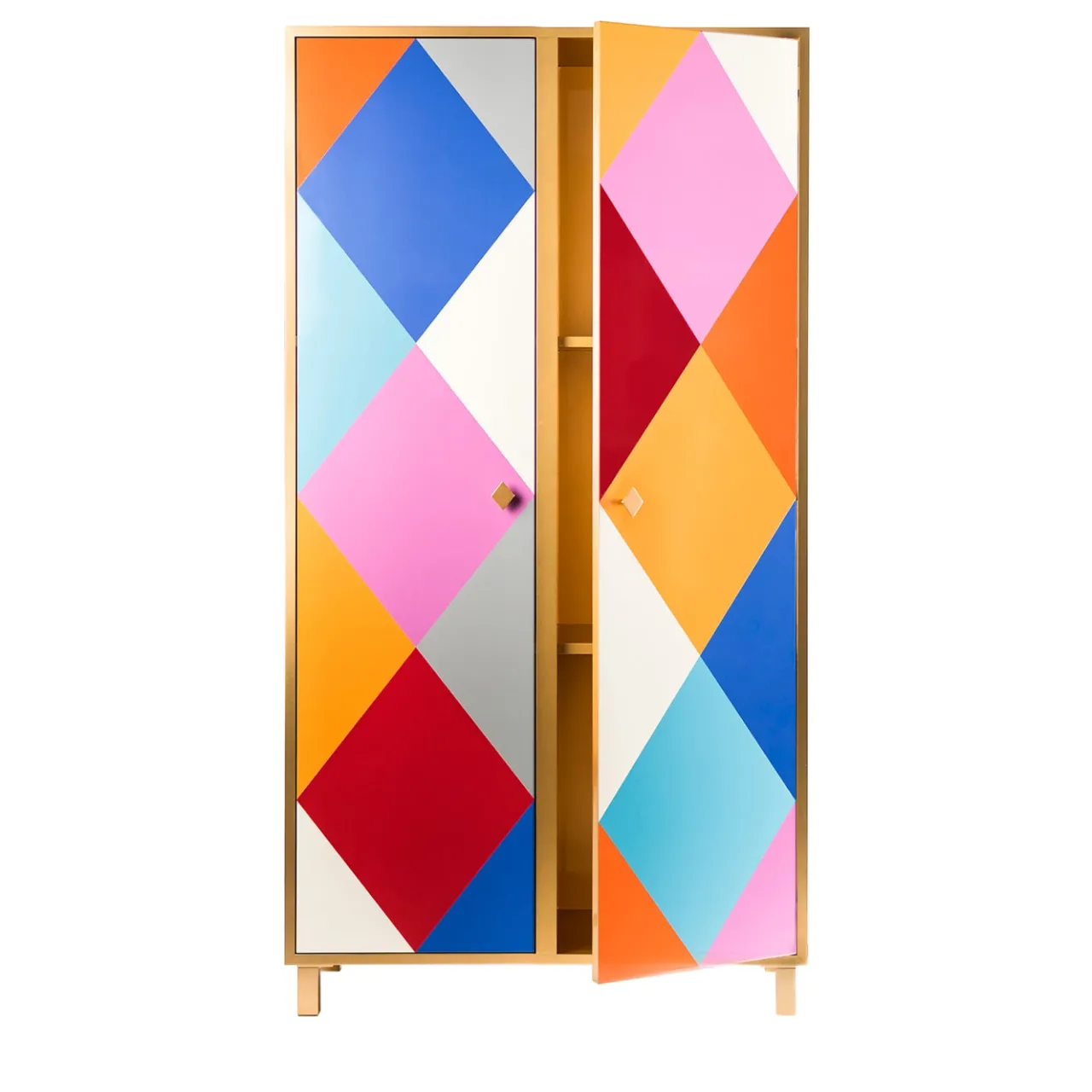 Le atmosfere allegre tipiche del Carnevale hanno ispirato questo accattivante armadio, che colpisce per il motivo a rombi policromi che si estende a tutte le ante. Realizzato accuratamente a mano in alluminio secondo metodi artigianali, presenta maniglie a forma di rombo che, una volta tirate, rivelano un ampio spazio per maglioni, jeans o biancheria. Ogni pezzo è unico e realizzato su ordinazione.