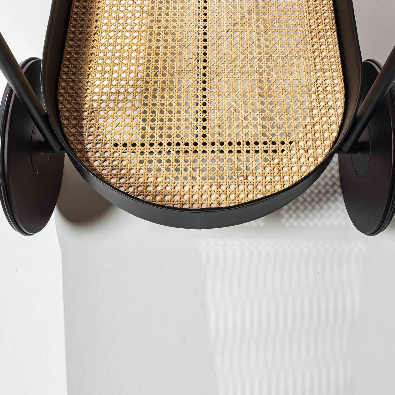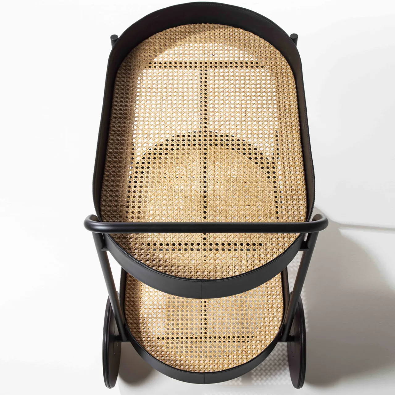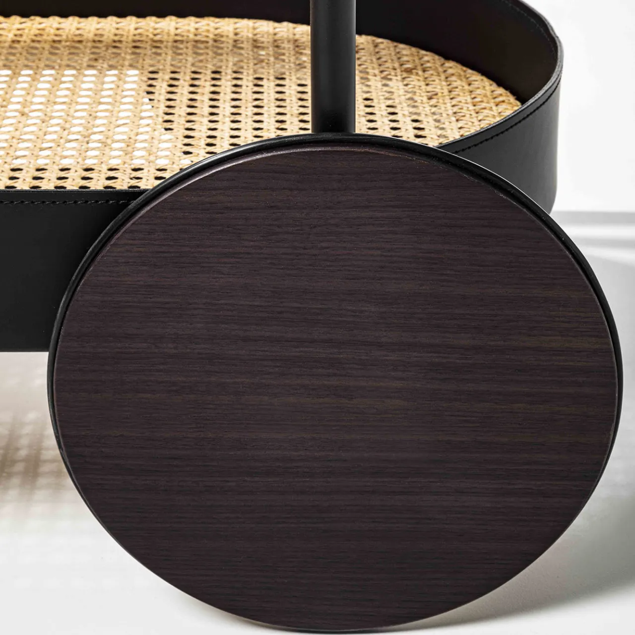 Carrello con struttura in metallo tubolare verniciato. Ruote e vassoi in legno, bordo rivestito in pelle. Tutti i componenti sono disponibili in altri colori. Per maggiori informazioni, contattare il concierge.