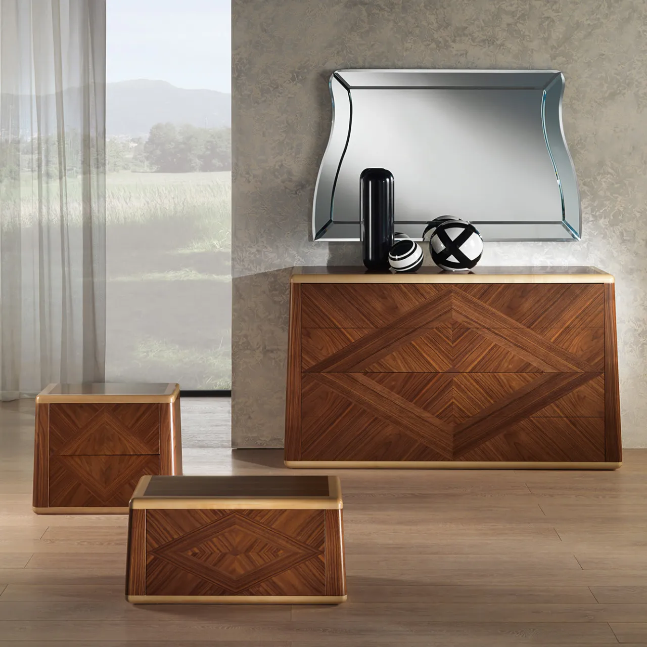 Sofisticata e senza tempo, la cassettiera Desyo aggiunge un fascino di metà secolo a qualsiasi camera da letto. Realizzato in noce canaletto naturale, il pezzo è incorniciato da bordi e piedi in acero. Il comò è poi sormontato da uno splendido intarsio a forma di rombo, che gli conferisce una sottile eleganza. Il pezzo fa parte di una collezione completa di mobili intarsiati.