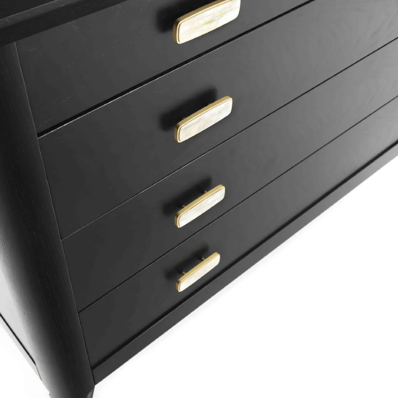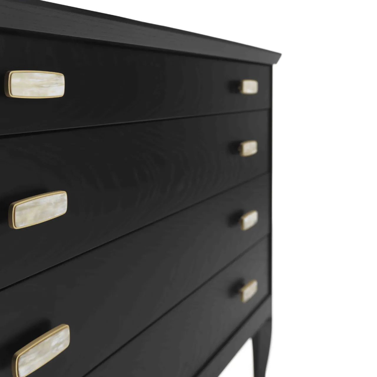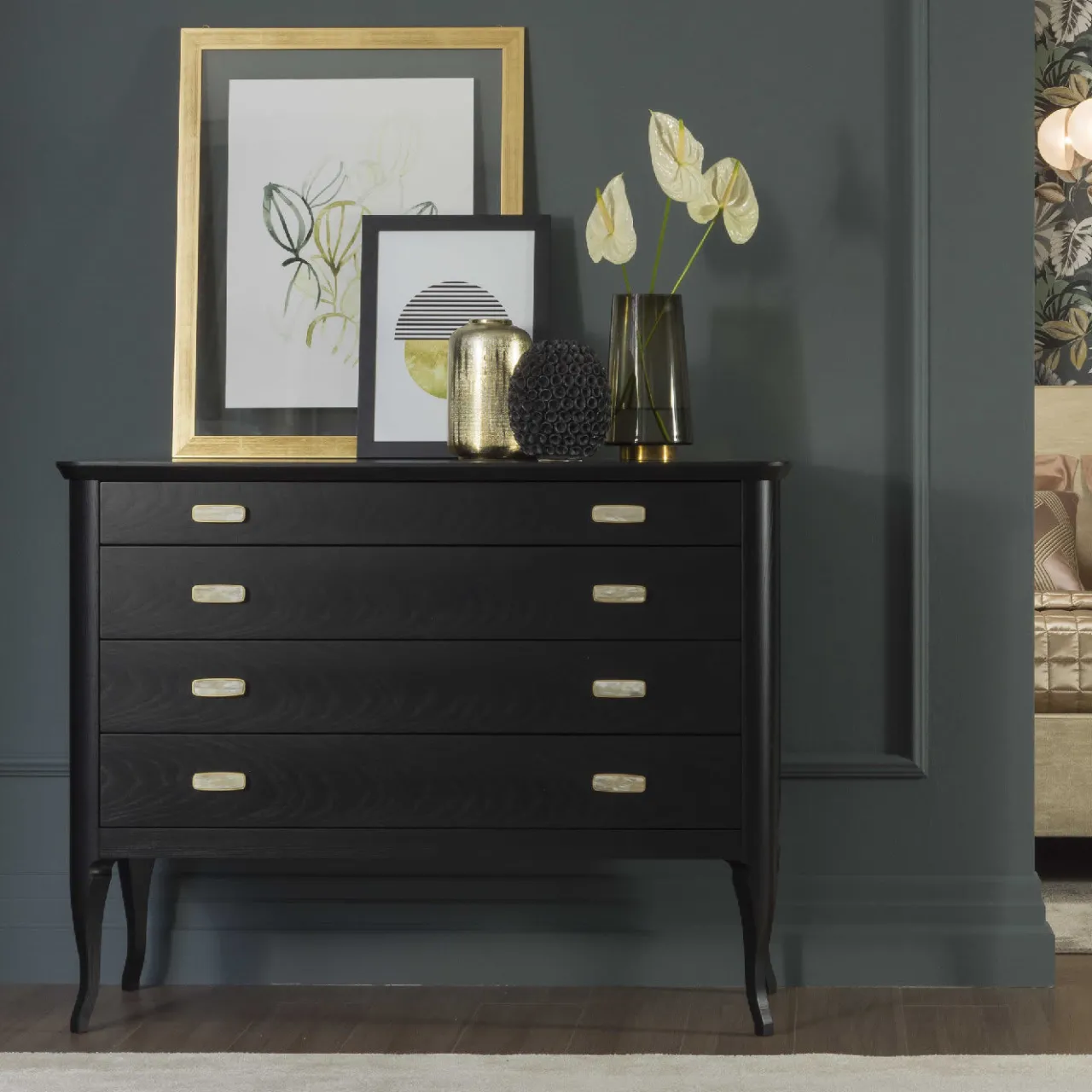 Estetica minimale e design funzionale definiscono questa squisita cassettiera che si adatta perfettamente a un soggiorno o a una camera da letto moderni e classici. Sostenuto da una struttura in legno impiallacciato di frassino con finitura ebanizzata, questo comò ha lati arrotondati e uno splendido piano con bordo esteso e arrotondato sostenuto da gambe in stile cabriole. Evocando l’eleganza dei mobili classici, questo mobile presenta due eleganti maniglie in ottone Art Déco con inserti in corno di bufalo su ciascuno dei quattro cassetti dotati di tecnologia Blumotion a chiusura ammortizzata. Questo design semplice ma chic eleva lo stile di qualsiasi arredamento.