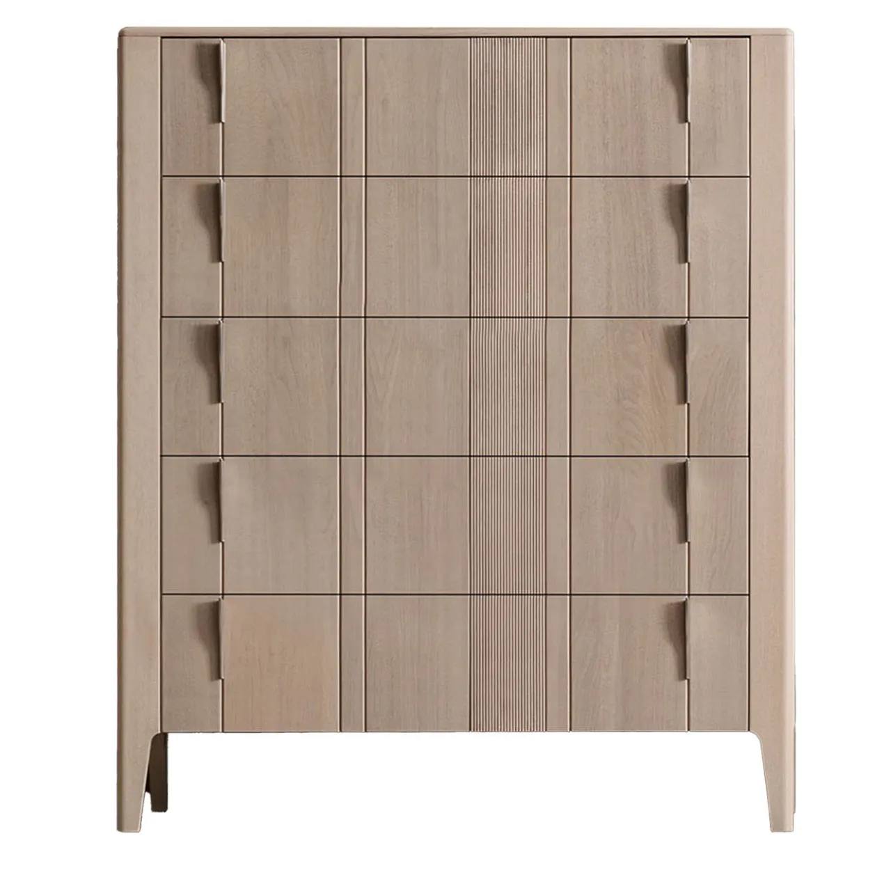 Linee slanciate e proporzioni armoniose definiscono l’eleganza senza sforzo che contraddistingue questa cassettiera, realizzata in un robusto pezzo di noce canaletto sigillato da una brillante e delicata vernice a base d’acqua. Inserti lineari e minuziosi dettagli scanalati ornano il frontale dei cinque cassetti, il cui design a chiusura ammortizzata con guide di scorrimento è completato dalla presenza di maniglie minimaliste in nichel. Per una sensazione di coesione, si consiglia di esplorare la controparte del comodino nel catalogo Artemest.