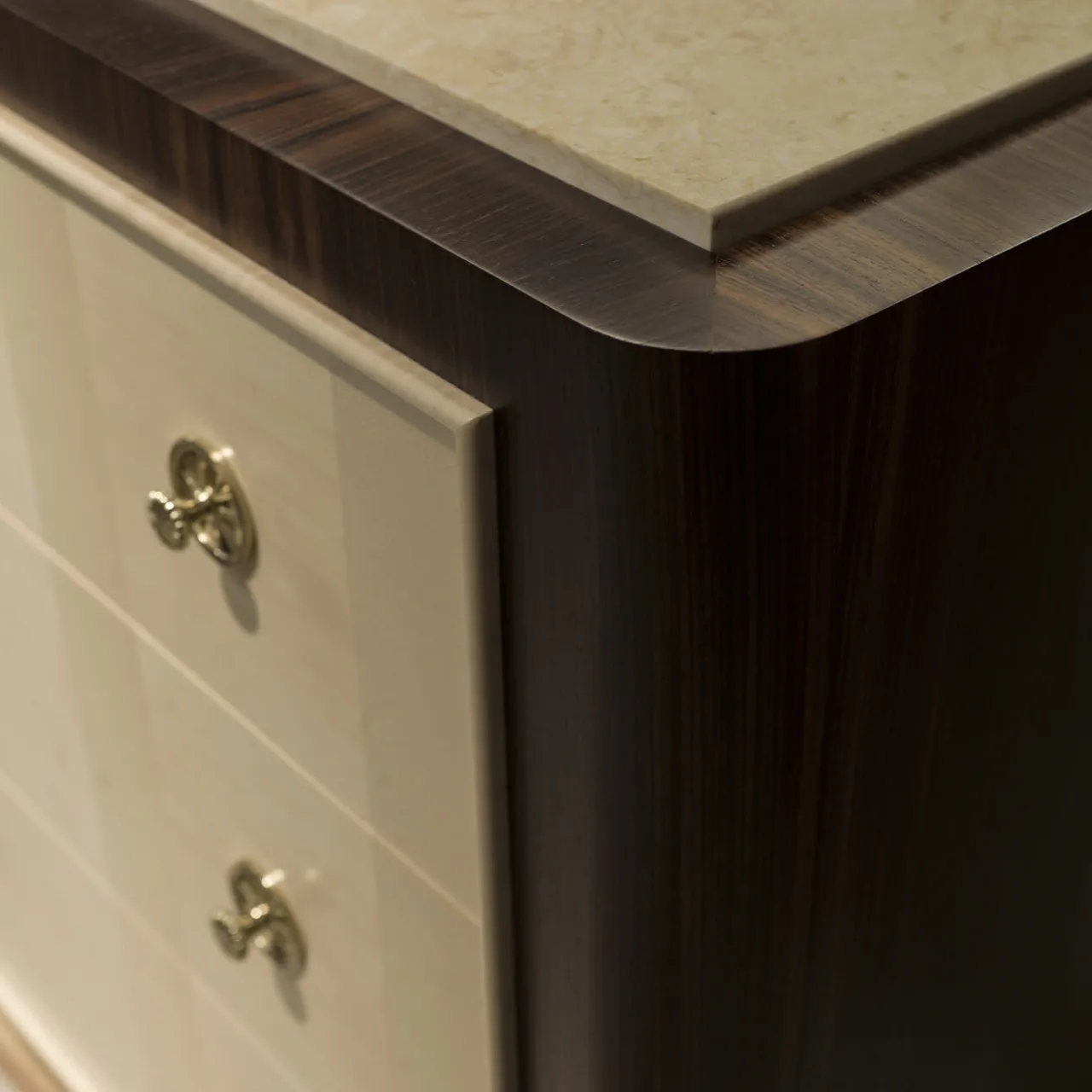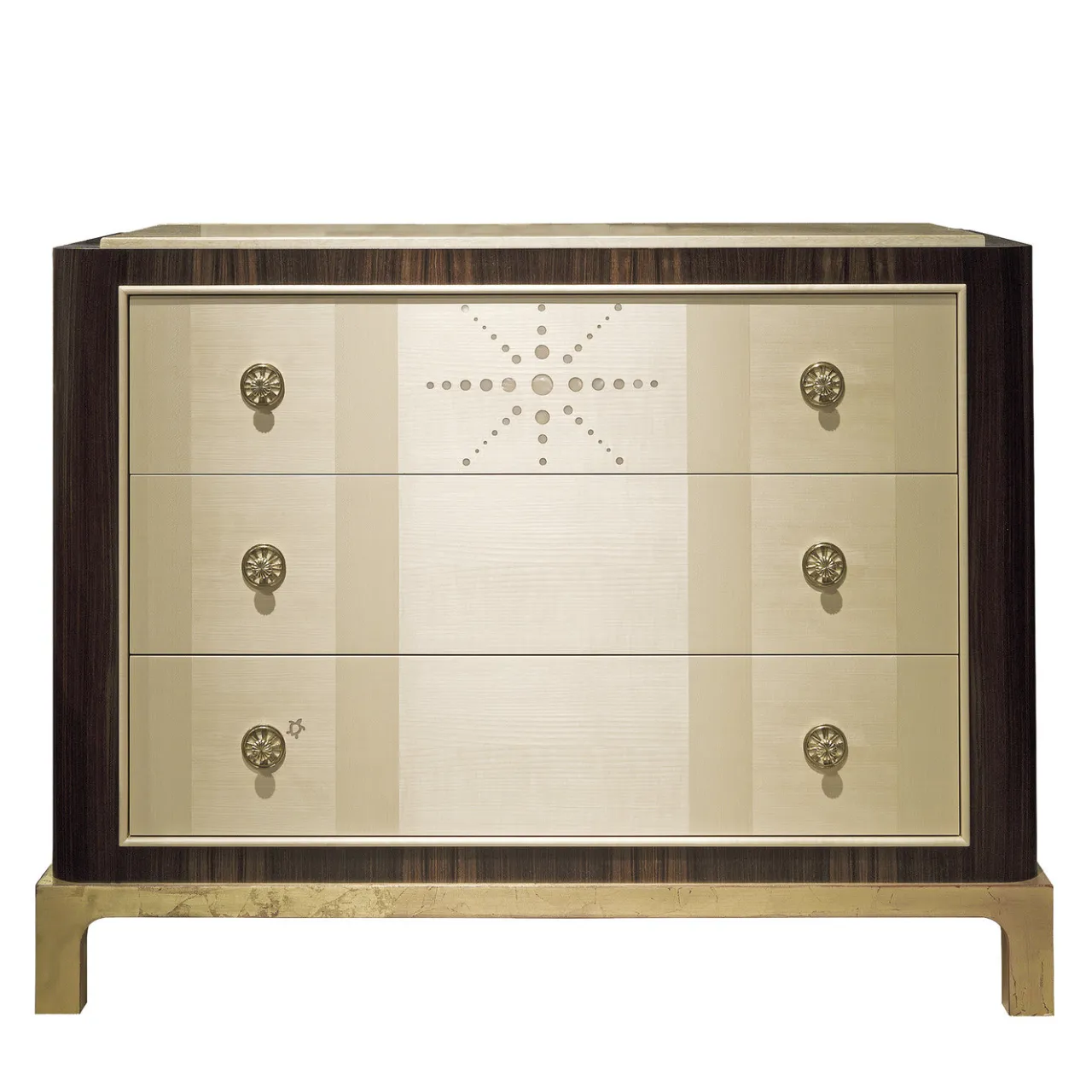 Questo comò è stato realizzato a mano in palissandro e acero, un pezzo di arredamento funzionale che arricchirà una camera da letto classica o contemporanea. Il contrasto tra le tonalità calde e scure del palissandro e il color miele dell’acero crea una combinazione di colori unica nel suo genere, impreziosita dagli intarsi in acero sui pannelli dei tre cassetti. Gli inserti in madreperla e la maniglia in ottone completano il superbo frontale, mentre la base è in legno Toulipier con una lussuosa finitura dorata e il piano è in marmo Giallo Atlantide.