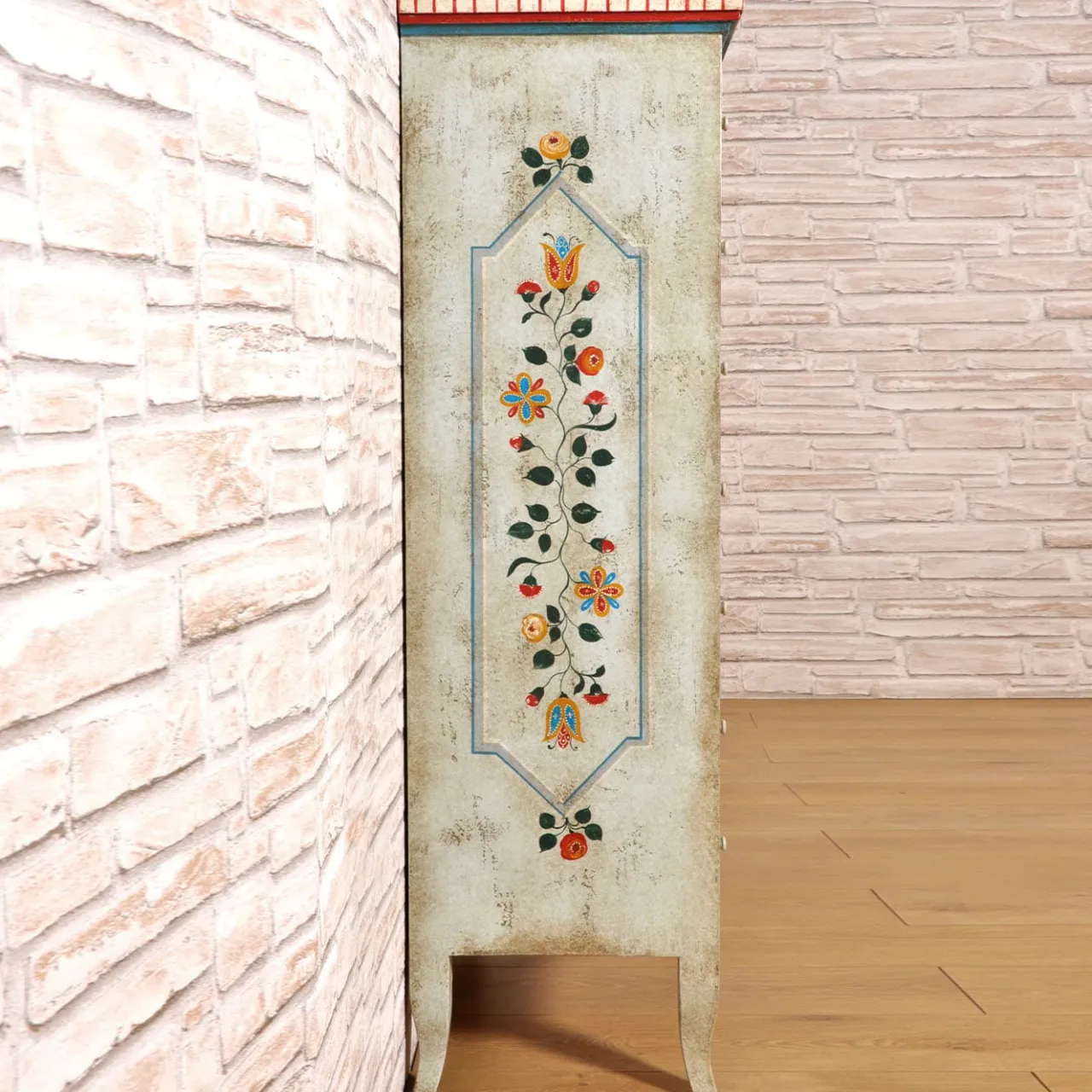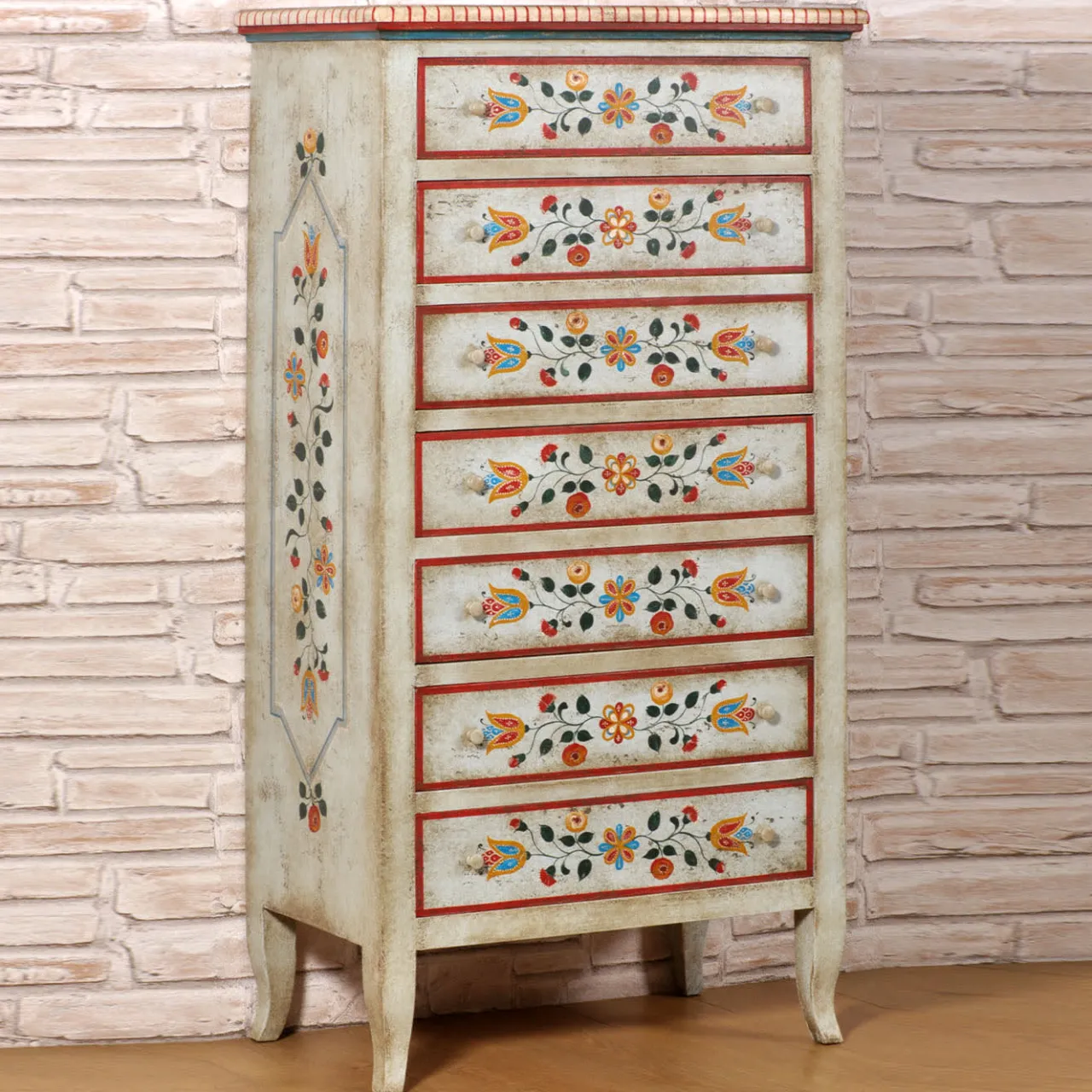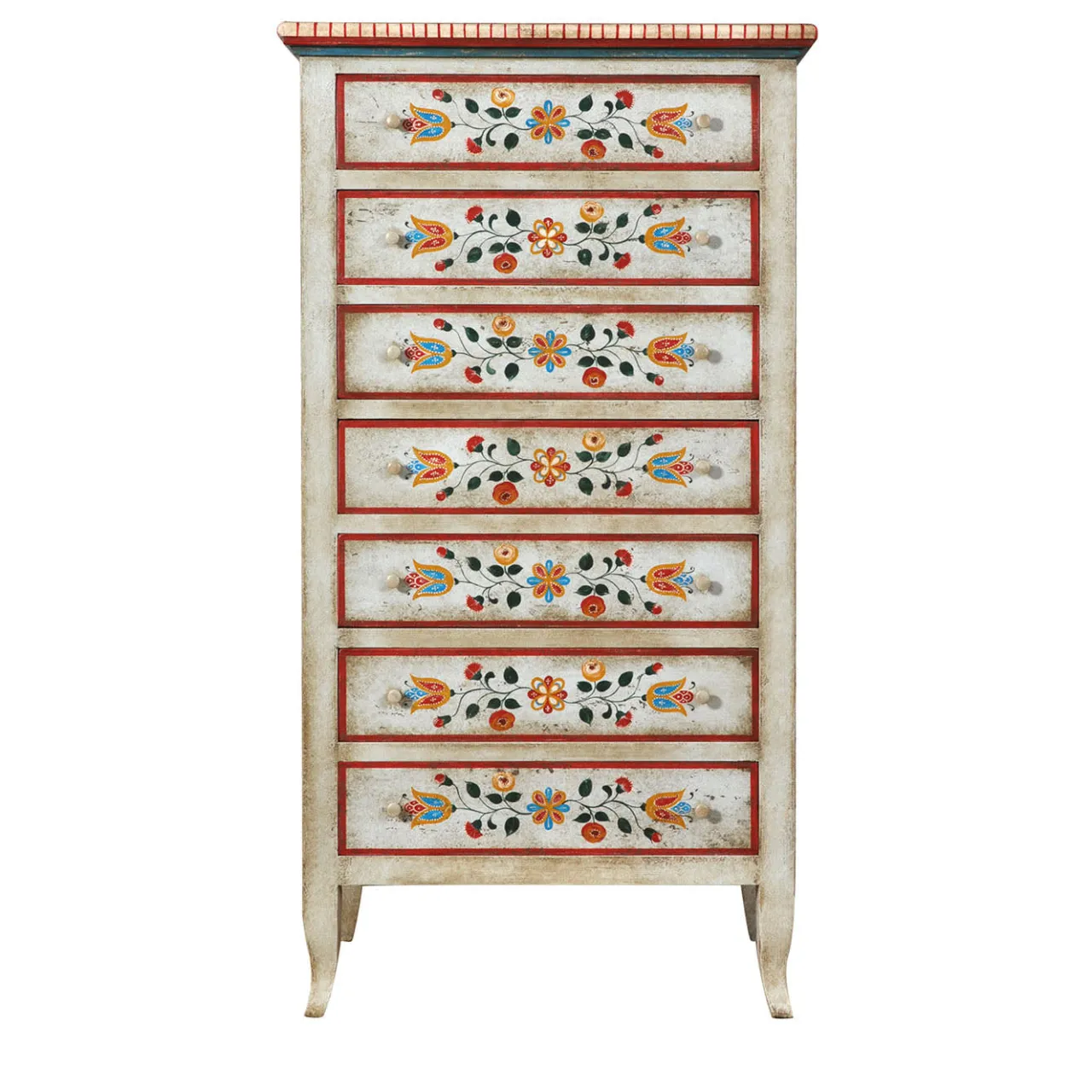 Graziosi piedi a cabriola sostengono la luminosa silhouette di questa cassettiera in legno, un superbo pezzo che celebra il mobile tirolese della fine del XVII secolo. Un trionfo di motivi floreali policromi adorna i sette cassetti, la cui tonalità emerge vividamente contro la superficie bianca patinata. Abilmente decorato seguendo antiche e segrete tecniche artigianali, può essere personalizzato su richiesta al Concierge.