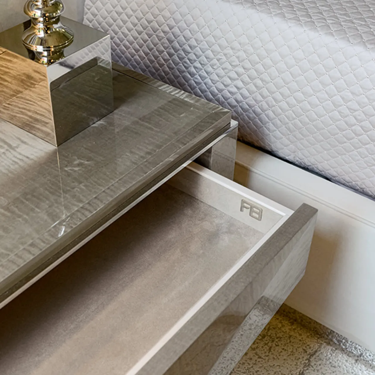 Comò a un cassetto con finiture in metallo e apertura push pull. Caratterizzata da una finitura lucida Lupo, i dettagli sono in metallo cromato.