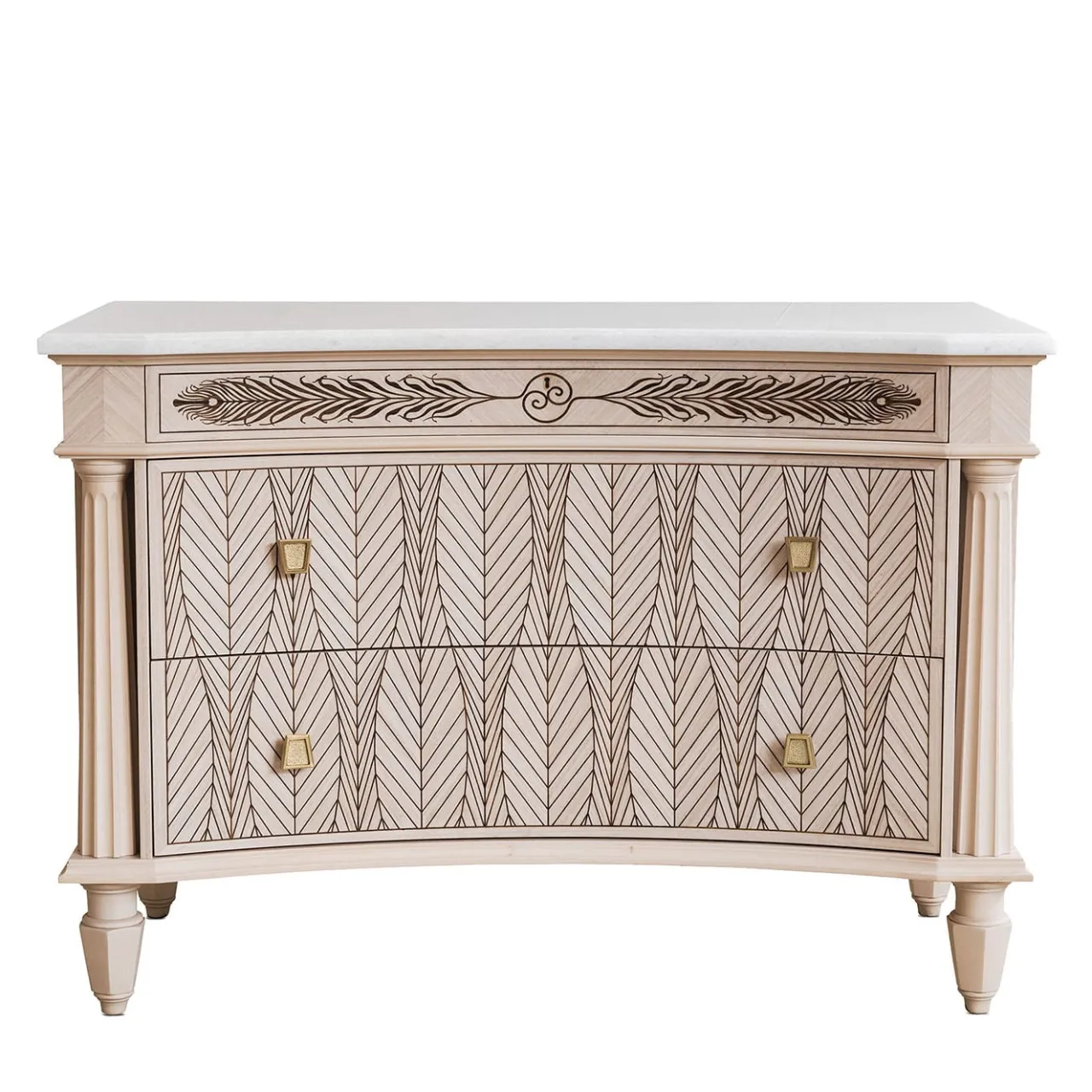 Questa cassettiera è realizzata a mano e presenta una raffinata struttura in eucalipto intarsiato ornata da un prezioso piano in marmo.