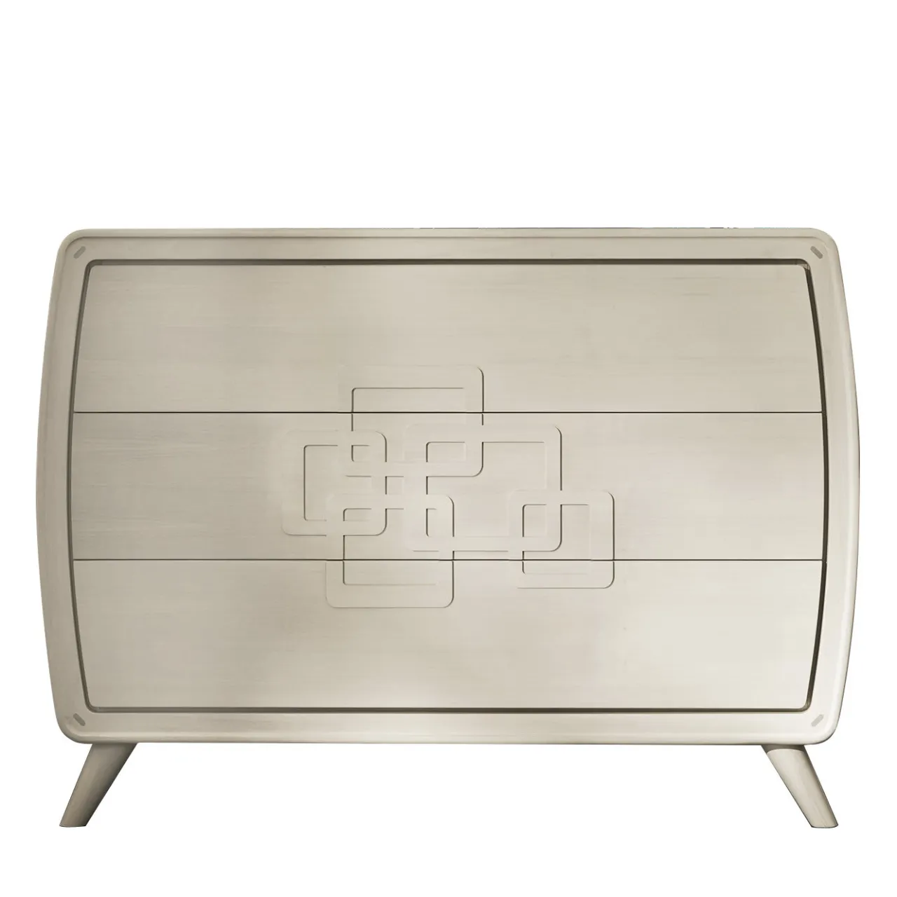 Questa affascinante cassettiera combina l’eleganza dello stile di metà secolo con la sensibilità contemporanea. Interamente realizzato in noce, il pezzo presenta quattro gambe inclinate che sostengono un corpo con angoli curvi. I tre cassetti sono dotati di meccanismo push-pull senza maniglie. Al contrario, una decorazione geometrica intagliata sulla parte anteriore adorna il pezzo e rispecchia la sua delicata silhouette.