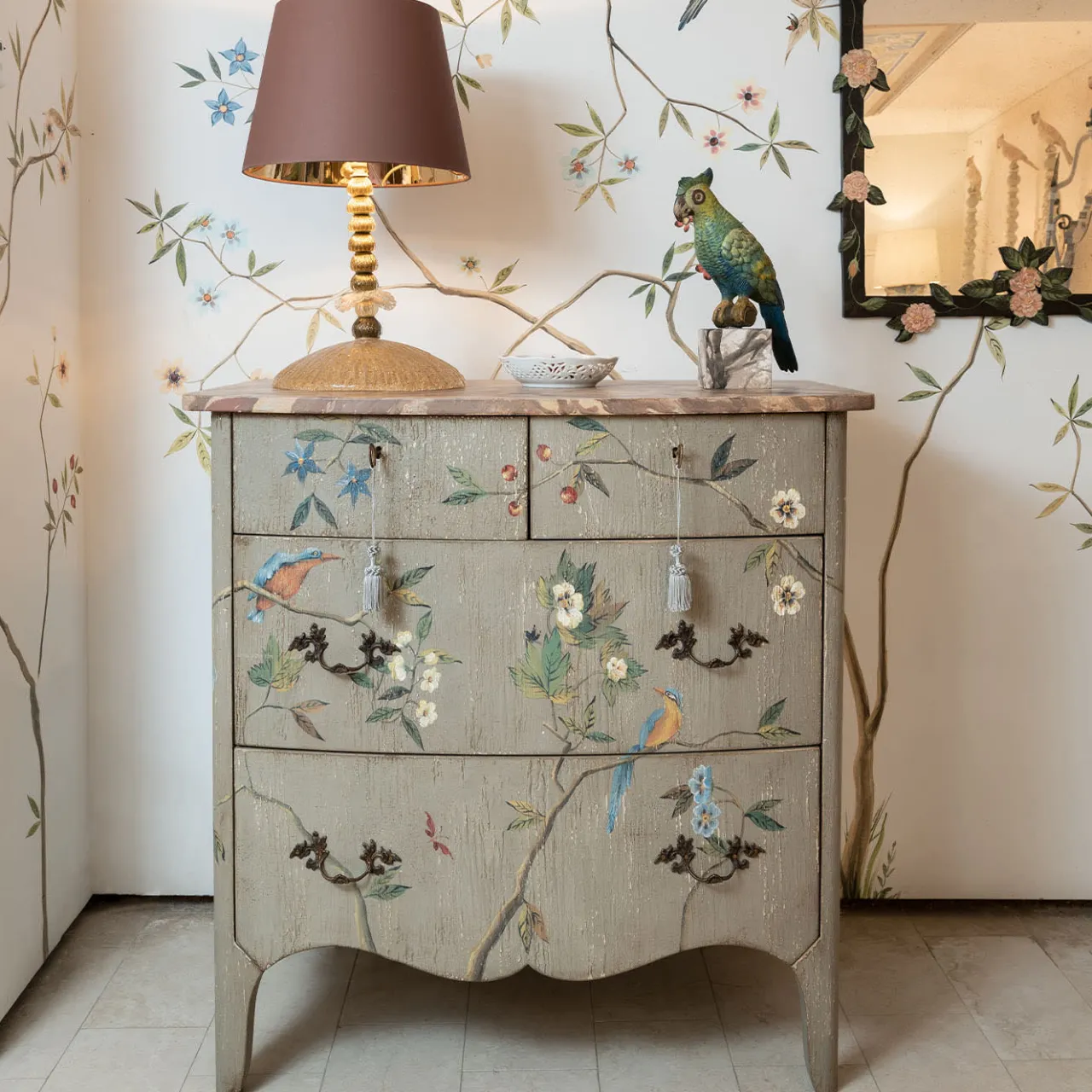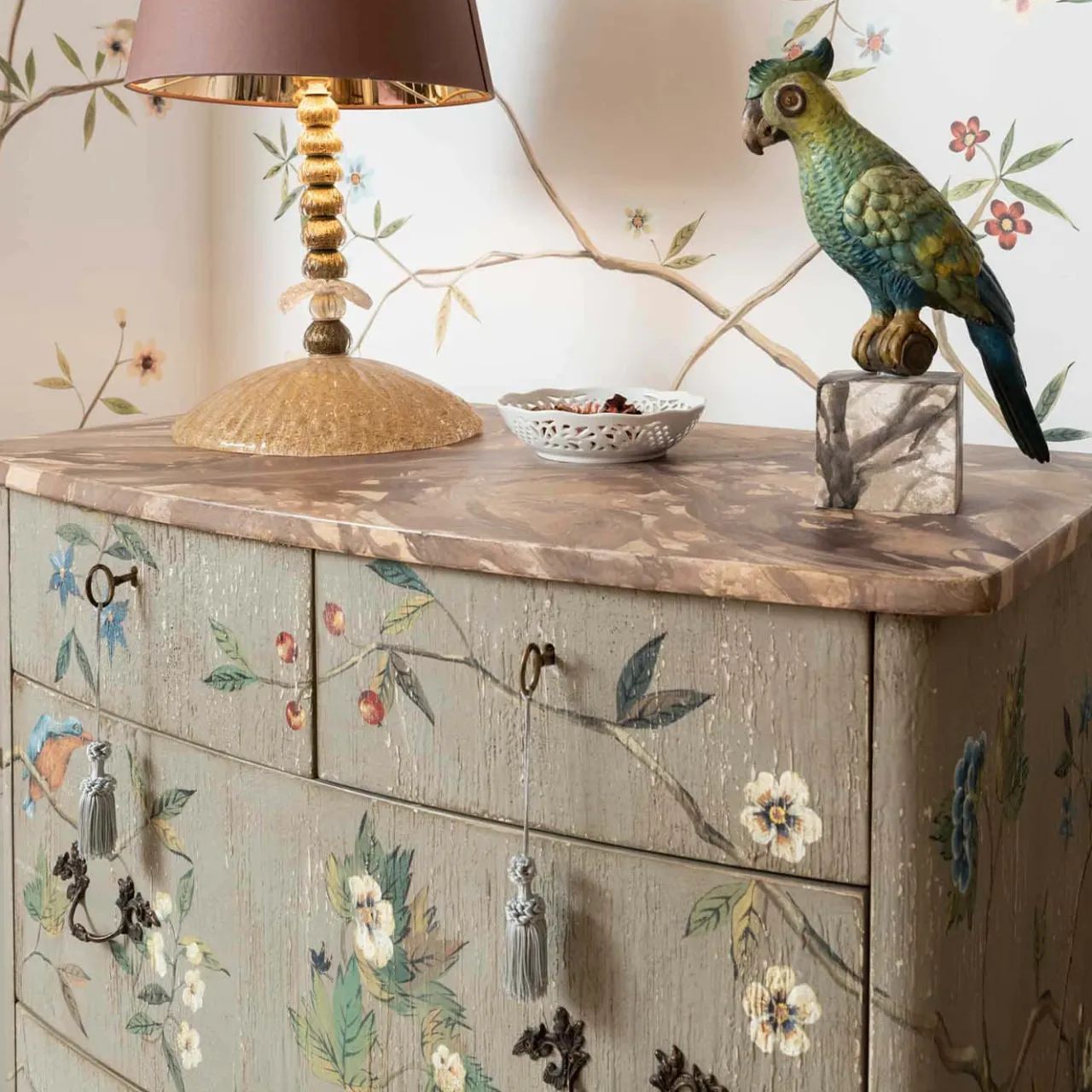 Capolavoro dell’artigianato, questa cassettiera è minuziosamente dipinta a mano secondo le tecniche tradizionali veneziane. Le linee sinuose e classiche che definiscono la silhouette in legno dipinto di verde vantano un’ampia decorazione di rami in fiore su cui sono appollaiati degli uccelli. Disponibile anche con uno strato aggiuntivo sopra la parte superiore per una maggiore durata, il pezzo è ampiamente personalizzabile; per maggiori dettagli, contattare il Concierge.