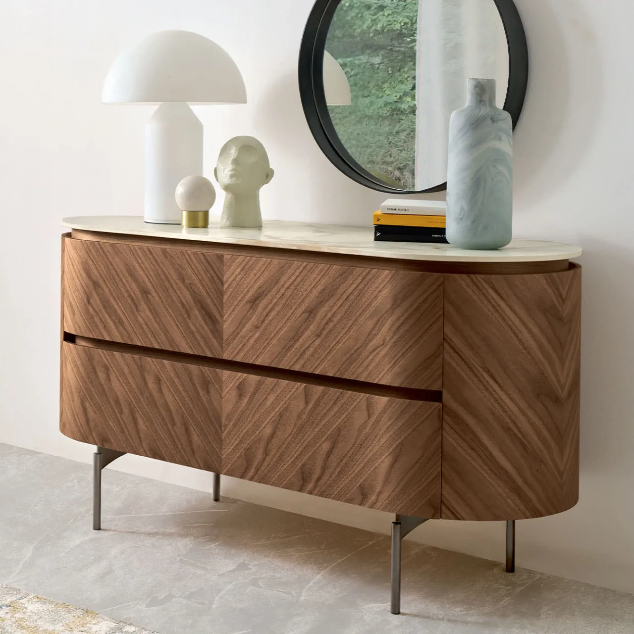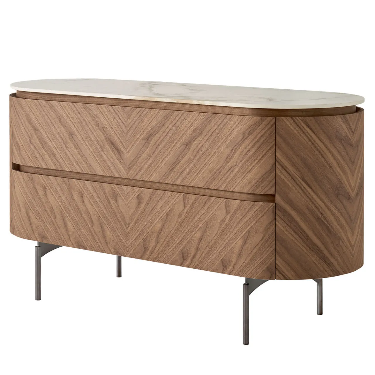 Un’armoniosa miscela di materiali, questo comò bilancia il calore del noce avana con la raffinatezza del piano in ceramica Calacatta. L’impiallacciatura a spina di pesce meticolosamente lavorata scorre senza soluzione di continuità sulla struttura curva, ammorbidendone il profilo geometrico. Due cassetti con scanalature nascoste e binari ammortizzati assicurano un look elegante e senza maniglie, mentre le gambe in nichel creano un contrasto leggero. Progettato per spaziose zone giorno, trasforma l’utilità in eleganza senza tempo.