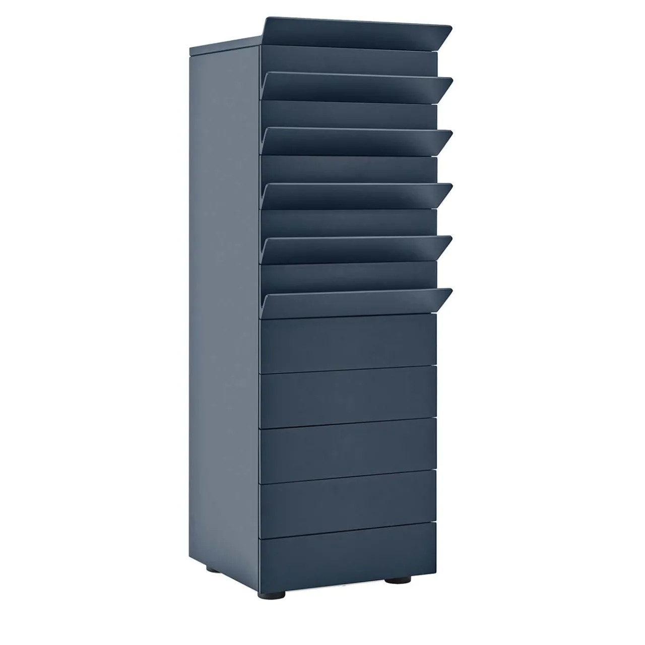 Questa struttura a forma di totem è stata disegnata da Lorenzo Damiani nell’ambito della collezione Overlooking, una serie di pezzi in massello di noce canaletto la cui forma evoca il concetto di casa, con lo spazio interno che contiene le necessità quotidiane e gli elementi scultorei della maniglia, con le loro sagome diagonali sporgenti, come balconi. Sofisticato e moderno, questo pezzo può essere abbinato agli altri della stessa collezione per un effetto di grande impatto.