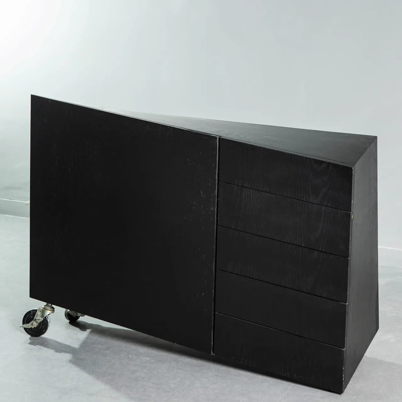 Il pezzo presenta una struttura realizzata in rovere laccato nero opaco a poro aperto, che mette in evidenza le venature naturali del legno. Impreziosito da ruote in stile industriale, unisce l’eleganza moderna a un design funzionale e tagliente. Perfetto per aggiungere carattere e versatilità agli interni contemporanei.