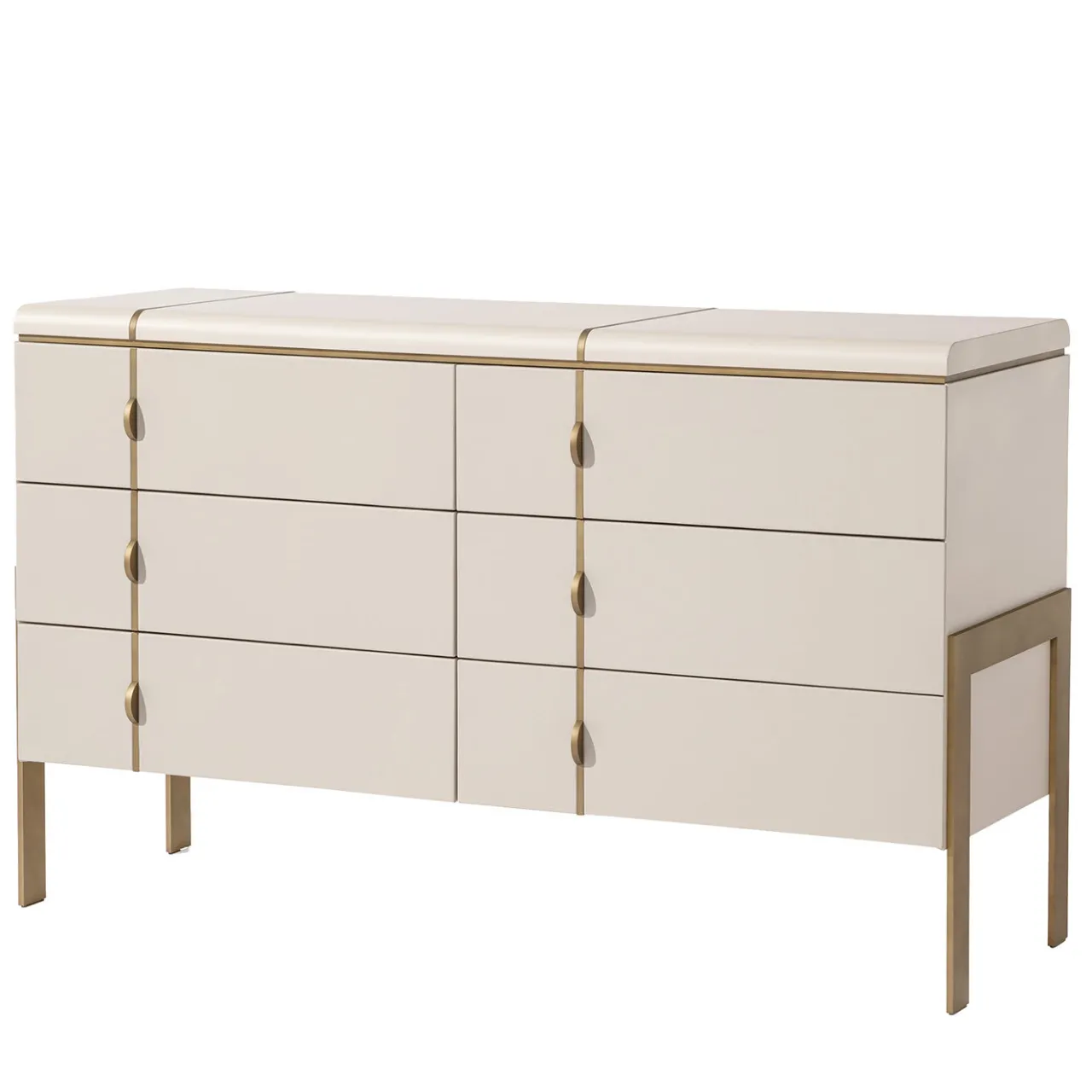 Complementare al Comodino Althea e al Vanity Table, questo splendido comò impreziosisce in modo unico una camera da letto contemporanea di lusso. Laccato bianco e impreziosito da inserti in metallo, la struttura è dotata di sei cassetti e poggia su eleganti gambe in metallo a barra piatta. Personalizzabile, contattare il Concierge per ulteriori dettagli e opzioni.
