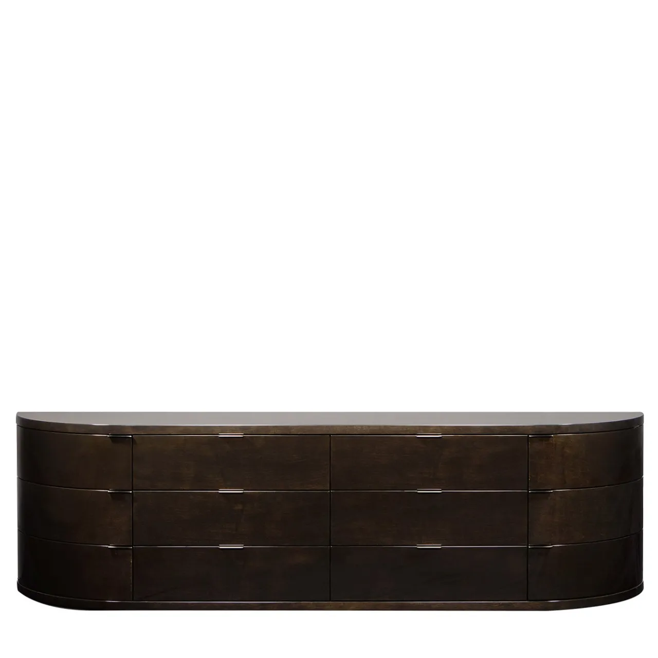 Questa cassettiera ha un elemento centrale dritto e lati arrotondati con maniglie in metallo. I sei cassetti esterni sono facilmente accessibili grazie a un particolare sistema di rotazione. Tutte le versioni hanno l’acero nero e la pelle stampata in bronzo lucido all’interno dei cassetti. Per ulteriori informazioni, contattare il Concierge.