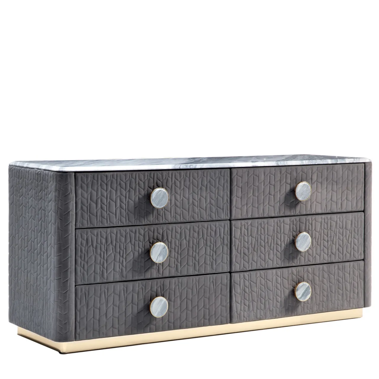 Comò piccolo in nubuk grigio trapuntato con piano in marmo smussato grigio alpi. Base in acciaio inox cromato oro chiaro. Sei grandi maniglie centrali in combinazione con acciaio inox cromato oro e marmo smussato.