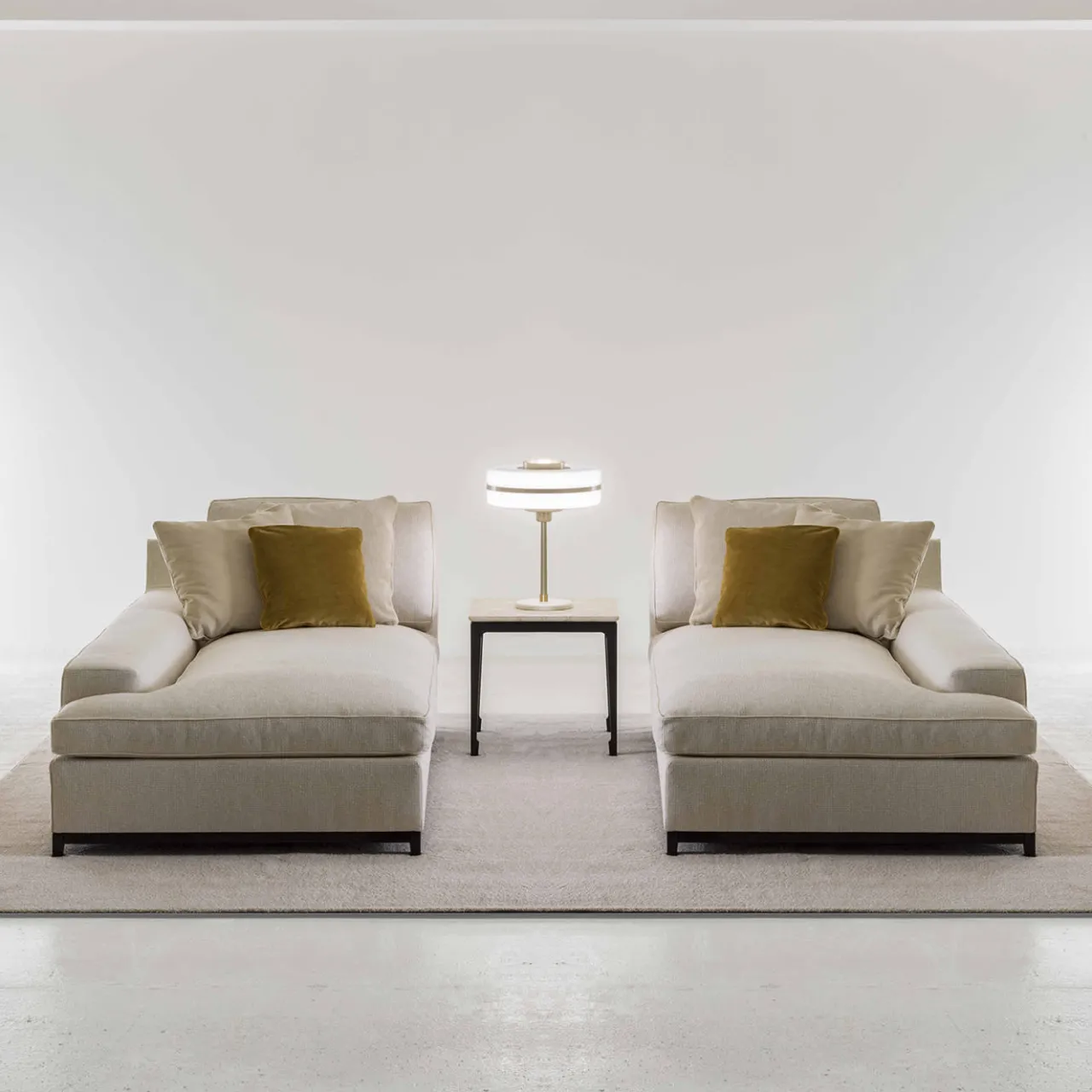 Questo divano presenta una struttura in multistrato e legno di frassino. La seduta è dotata di cinghie elastiche e i cuscini sono imbottiti in piuma d’oca con inserto in poliuretano. Il rivestimento della struttura non può essere rimosso, ma i cuscini sì. Questo pezzo fa parte di una serie di divani modulari che possono essere combinati insieme per formare qualcosa di unico.