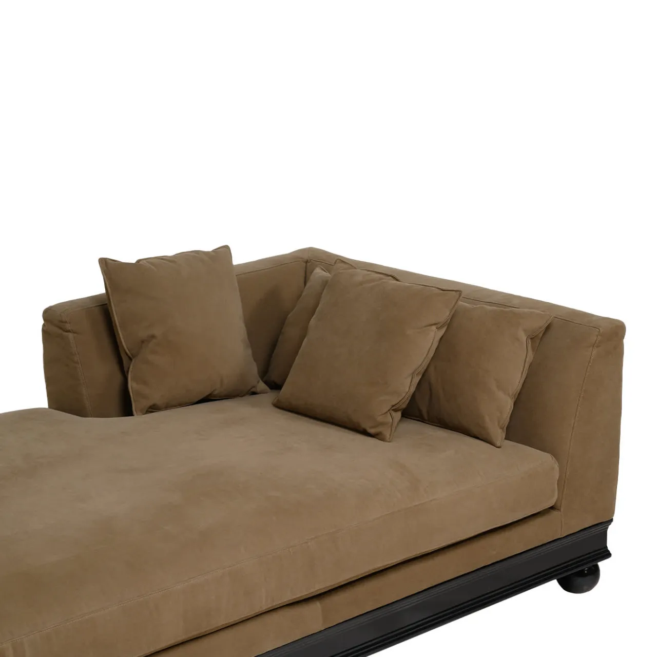 Questa raffinata chaise longue è stata progettata all’insegna del comfort. Parte di una composizione modulare i cui elementi si trovano tutti nel catalogo Artemest, si distingue per la generosità dell’imbottitura interna e per la morbidezza del rivestimento in cotone marrone. La base in legno con piedi a sfera appiattiti è proposta in un’affascinante finitura nera lucida. I cuscini decorativi sono inclusi.