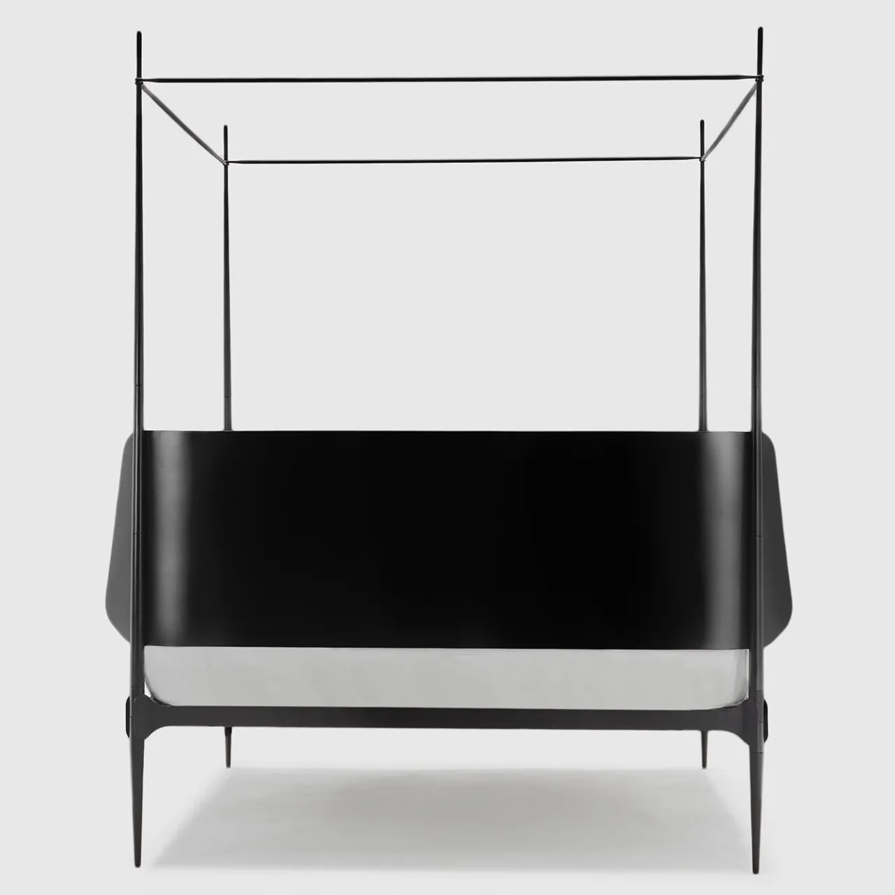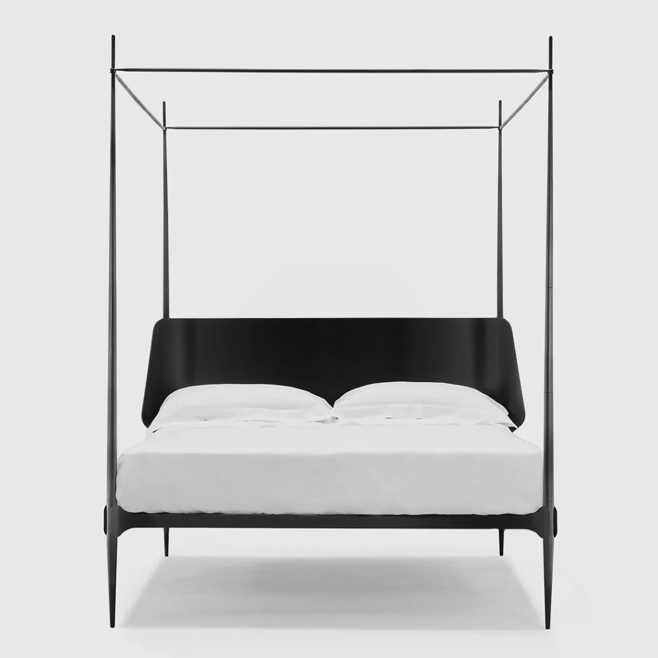 L’eleganza senza sforzo di volumi puliti realizzati in ferro conferisce a questo letto matrimoniale a baldacchino una classe senza tempo. Verniciata due volte per una finitura resistente e di qualità, la struttura è caratterizzata da montanti a giavellotto incastrati con la base del letto, un sistema di giunzione che ricorda una pinza e che suona semplice e affidabile. I lati leggermente inclinati e curvi caratterizzano la testata in lamiera di ferro, che favorisce un senso di protezione e intimità. Contattare il Concierge per versioni personalizzate.