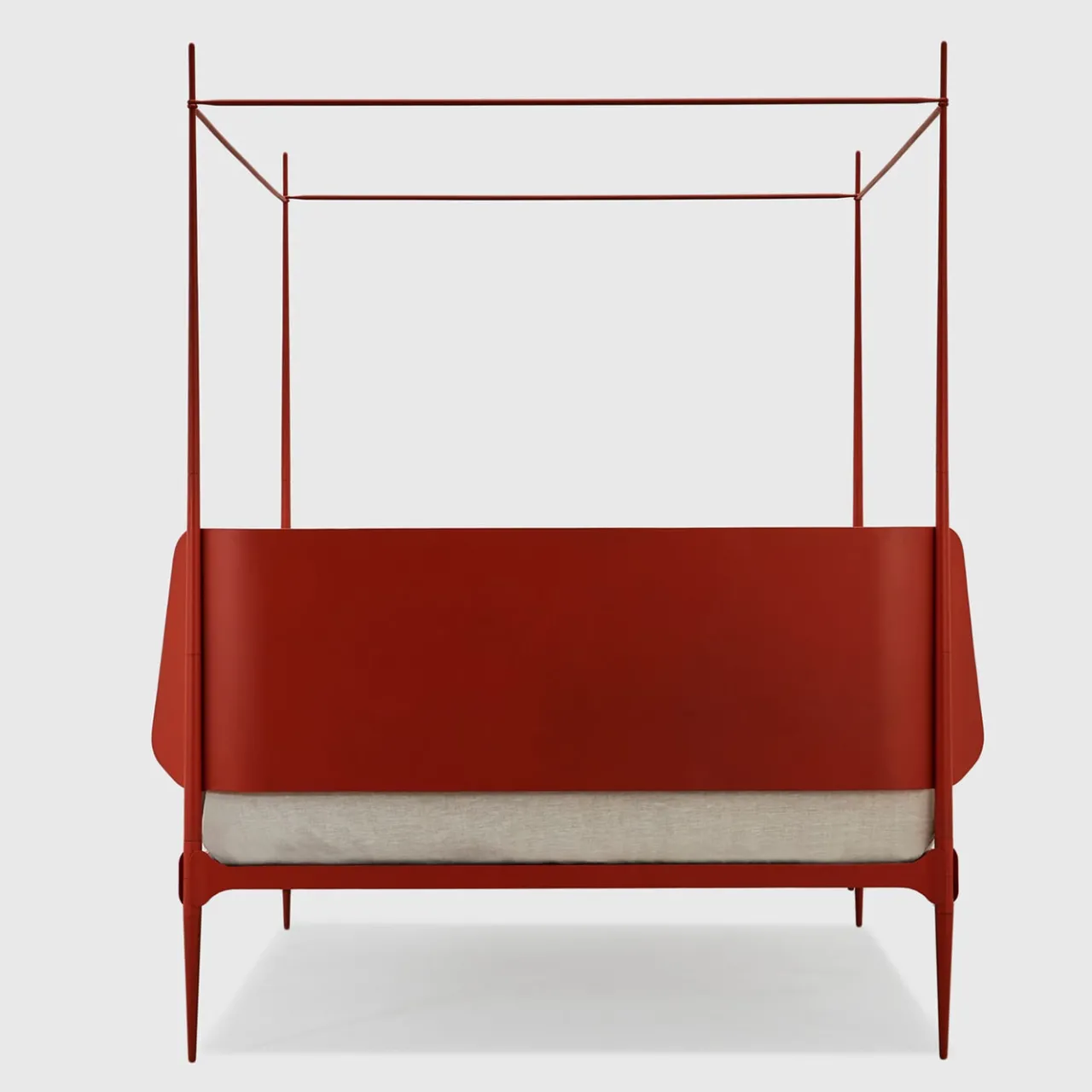 Elegante e vivace, questo letto matrimoniale a baldacchino realizzato in ferro e verniciato due volte per un rosso di alta qualità è un’aggiunta perfetta alle camere da letto moderne e colorate. Le giunzioni tra i quattro montanti a forma di giavellotto e la base del letto ricordano uno speciale meccanismo a pinza, una soluzione semplice che massimizza la solidità percepita del letto. Realizzata in lamiera di ferro, la testata con profili inclinati risulta leggermente curvata per un sottile effetto avvolgente. Per versioni personalizzate, contattare il Concierge.