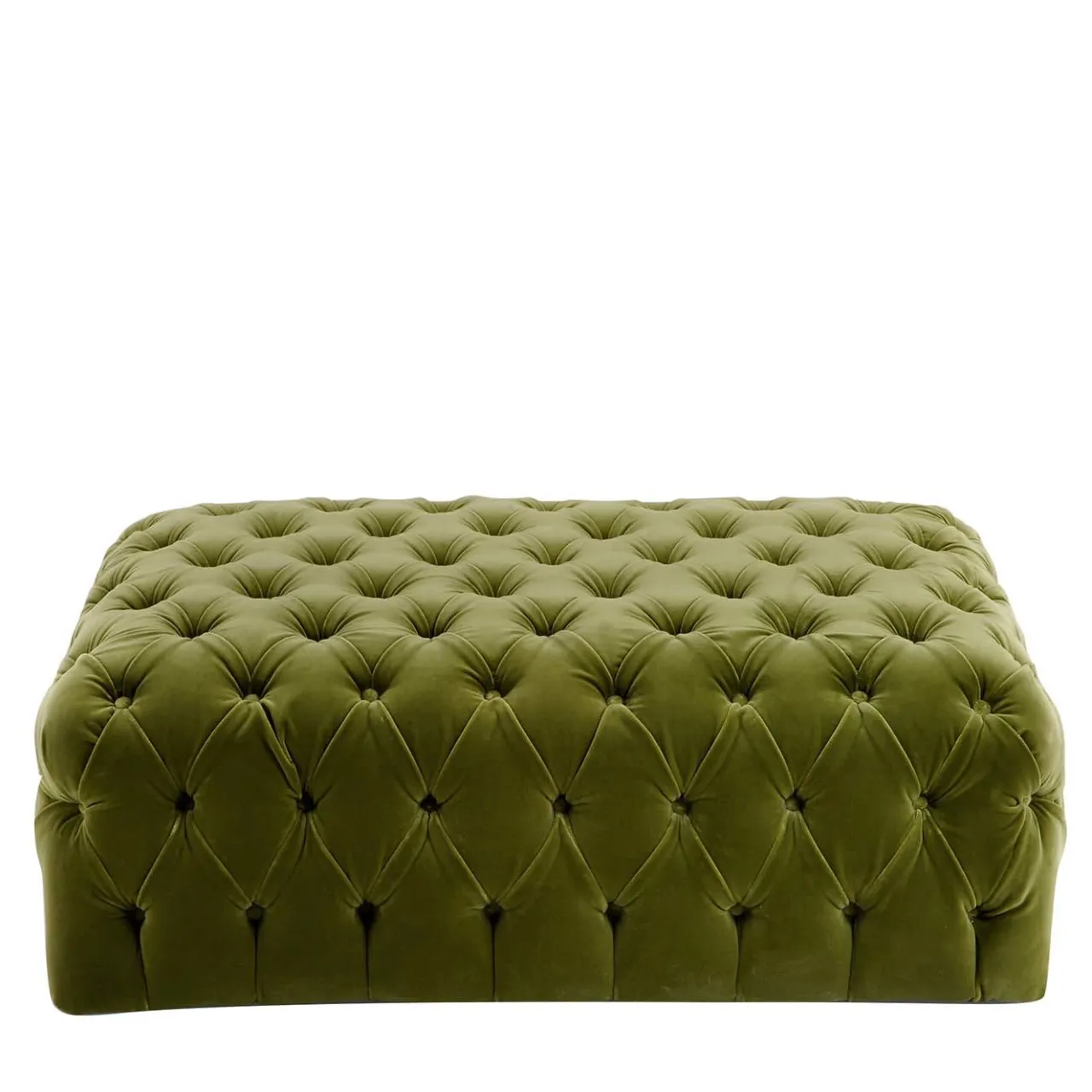 Protagonista del salotto, dove diventa un’isola centrale per esporre libri d’arte e vassoi, o davanti a un divano per accogliere gli ospiti, questo prezioso pouf è tanto elegante quanto funzionale. La struttura in multistrato e abete, imbottita in poliuretano multidensità, vanta un rivestimento in dacron verde cacciatore con una raffinata lavorazione a ciuffi. I piedi incassati sono in PVC.