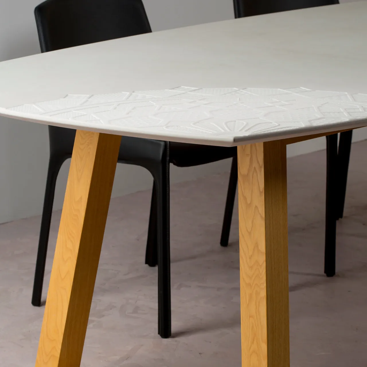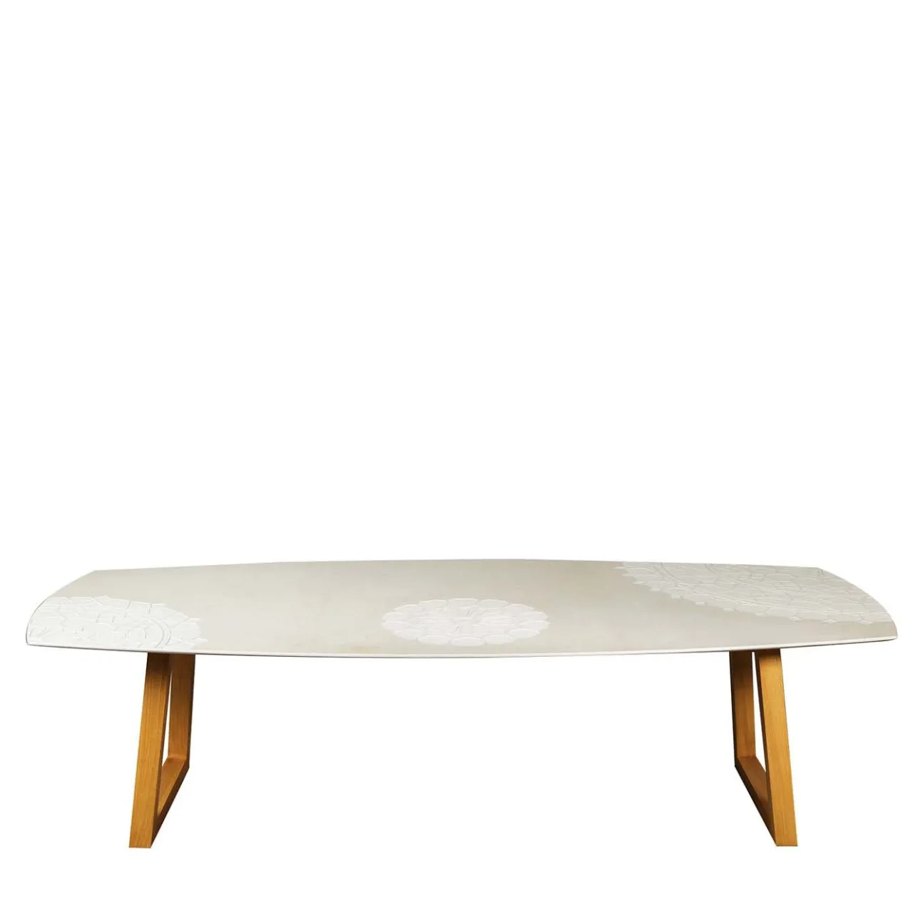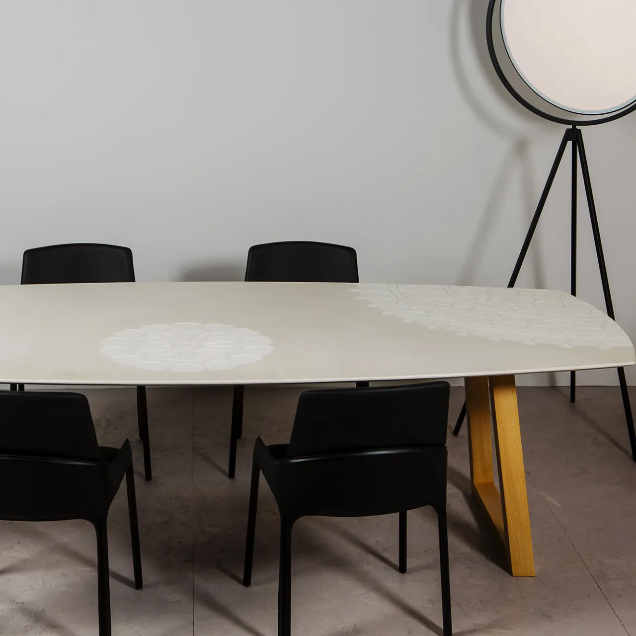 Questo tavolo da pranzo moderno e di grande impatto è realizzato in pietra Crema Tunisi. Il piano presenta una superficie squisitamente scolpita, che mette in mostra superbi centrini e rivestimenti. La struttura lineare ed elegante della base è realizzata in legno con finitura naturale. Questo sofisticato tavolo può essere personalizzato utilizzando per il piano il marmo Bianco Fenice, il marmo bianco di Carrara, la pietra Bardiglio Imperiale e la pietra Pece.