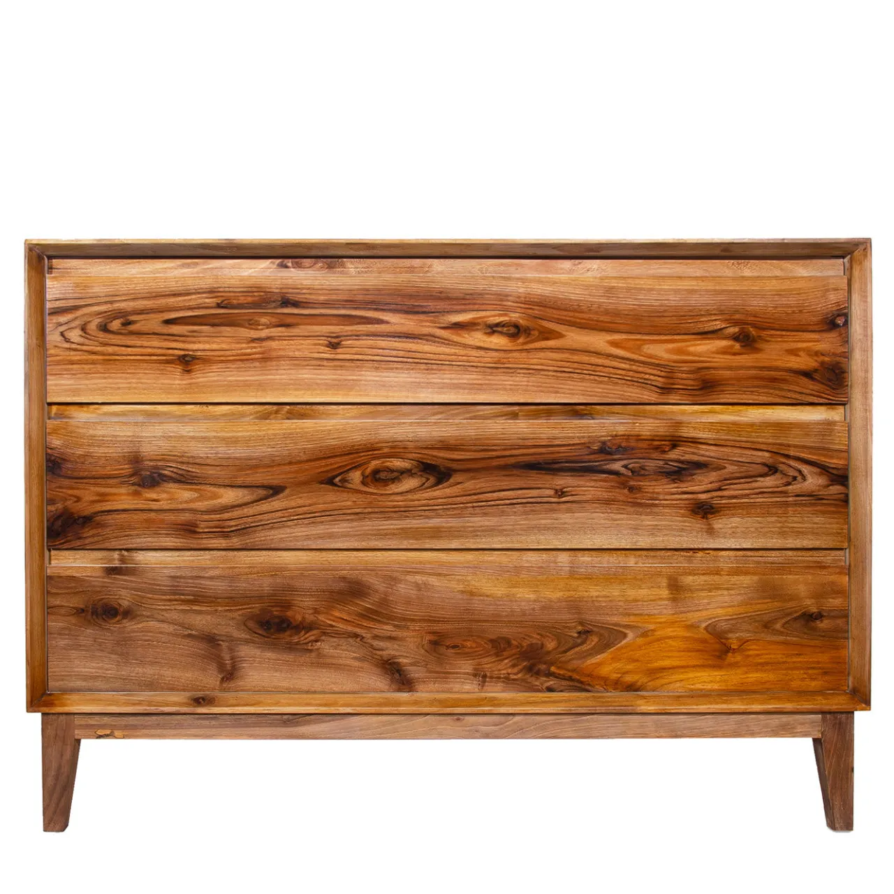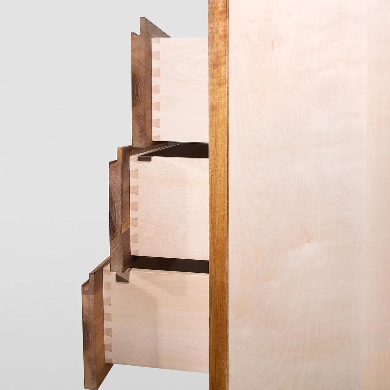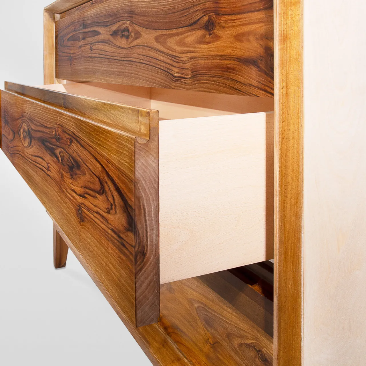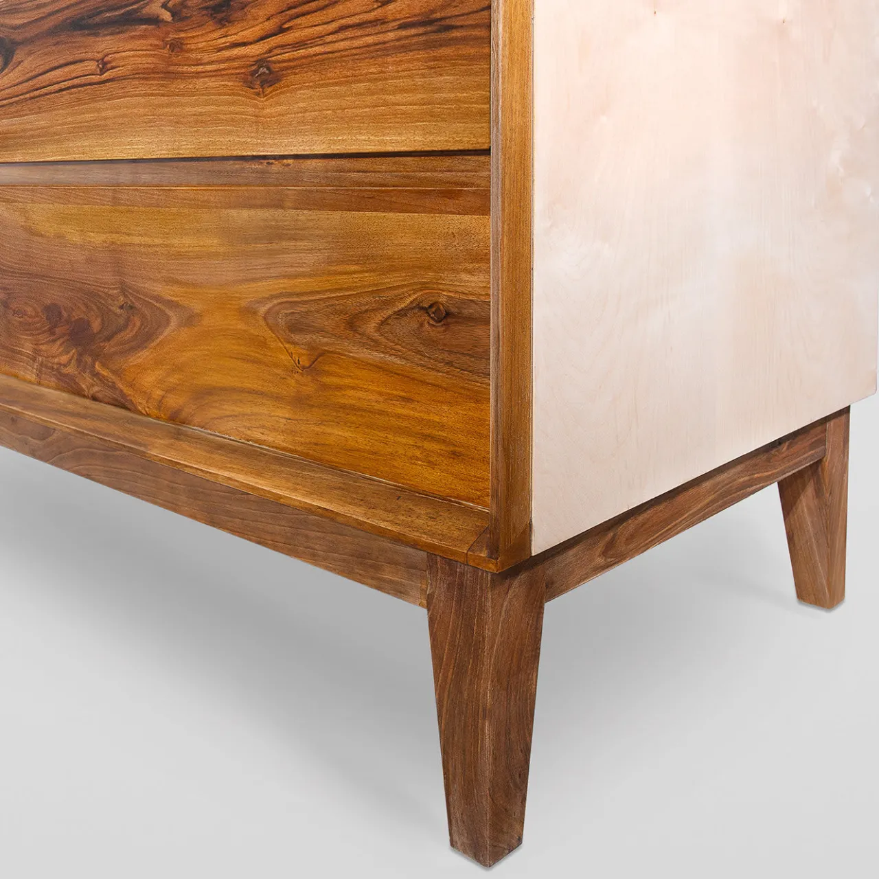Sublime omaggio alla magnificenza del legno, questo comò a tre cassetti è interamente realizzato e rifinito da mani esperte e sapienti. Realizzato in legno massiccio, è composto da noce per la base e da essenza di acero per il corpo principale. Rifinito a mano con una laccatura lucida, i cassetti sono dotati di guide di scorrimento metalliche nascoste (marchio BLUM). Il pezzo è brillantemente verniciato con una lacca a base d’acqua e infine rifinito con cera d’api per un’allure assolutamente raffinata. Personalizzabile su richiesta.