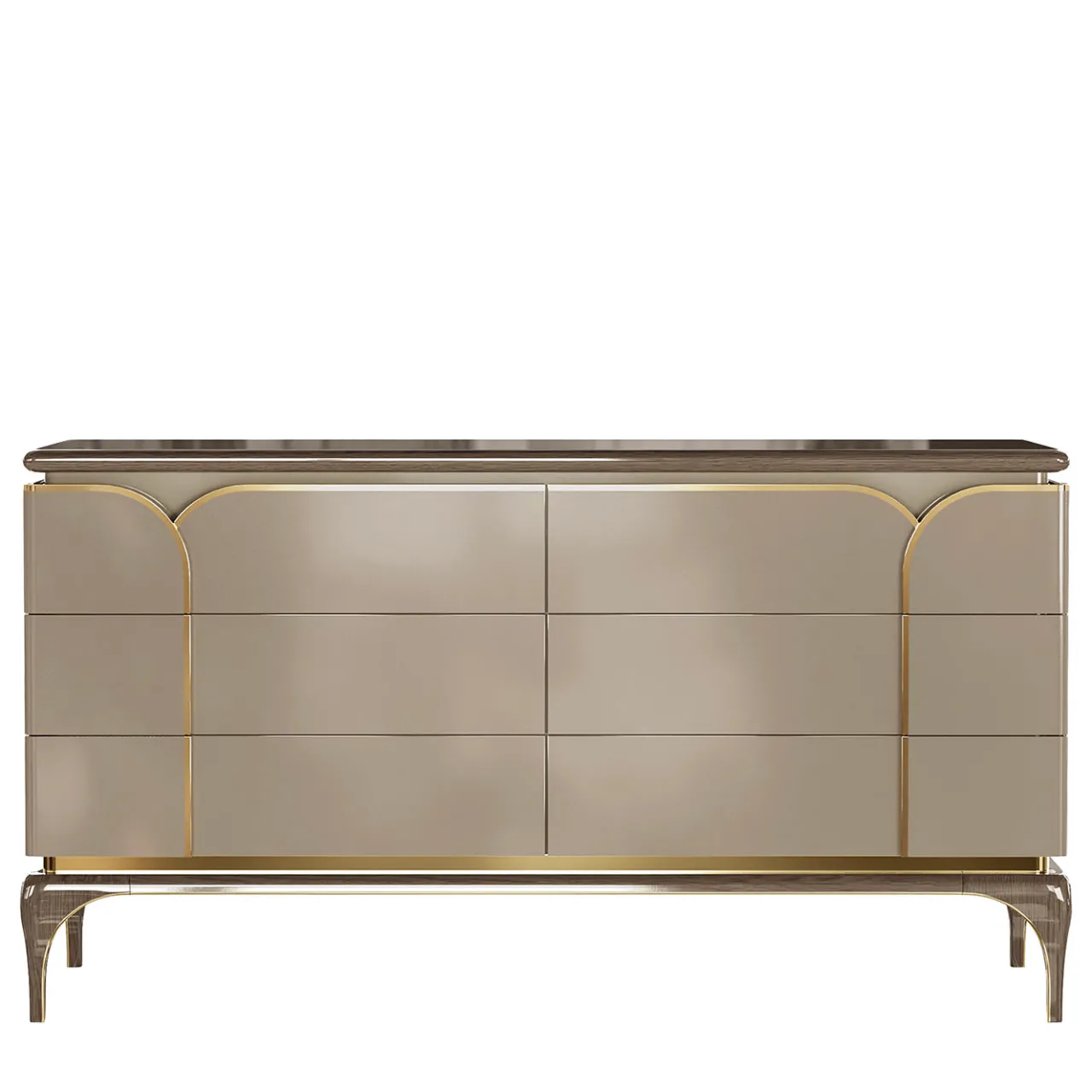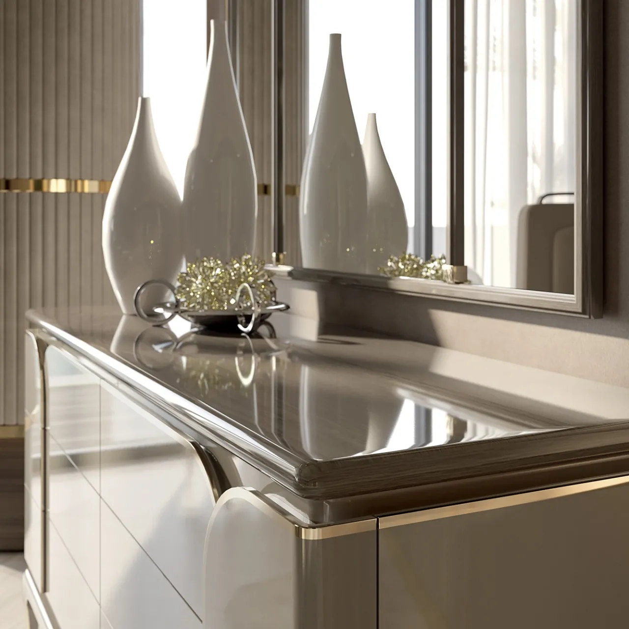 Complemento ideale di un salotto o di una sala da pranzo dall’arredamento raffinato e moderno, questo stupendo comò è abilmente realizzato a mano con materiali di alta qualità e un’attenzione minuziosa ai dettagli. Realizzato in legno laccato e lucidato, presenta quattro ante arricchite da un elegante profilo in metallo dorato.