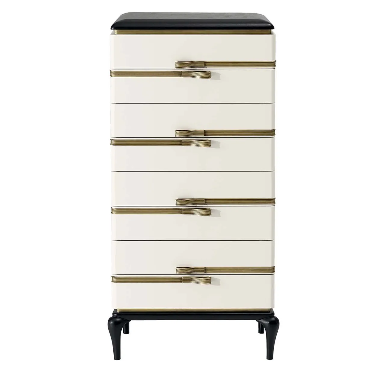 Questo comò alto bianco rinnoverà il look di una camera da letto moderna, soprattutto se abbinato al comodino bianco e al comò basso dello stesso designer. Con una struttura in multistrato e MDF impiallacciato frassino laccato bianco, sia la base che il piano sono in frassino massiccio rifinito con vernice nera a poro aperto. I cassetti hanno maniglie in ottone brunito e sono dotati di sistema di chiusura Blum.