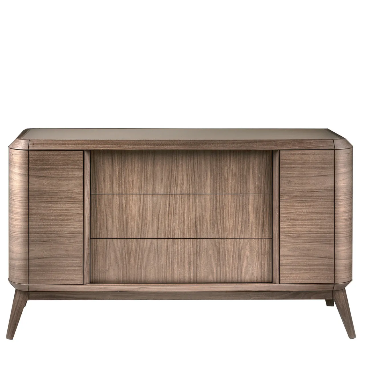 Una sapiente combinazione di materiali pregiati e angoli smussati caratterizza il design armonioso di questo comò che prende il nome dalla leggiadra Euridice, moglie di Orfeo nella mitologia greca. L’imponente struttura, che poggia su quattro piedi obliqui e affusolati, è abilmente realizzata in noce canaletto con una finitura satinata che ne mette in evidenza le caratteristiche venature. Il piano in pelle aggiunge ulteriore raffinatezza al pezzo.