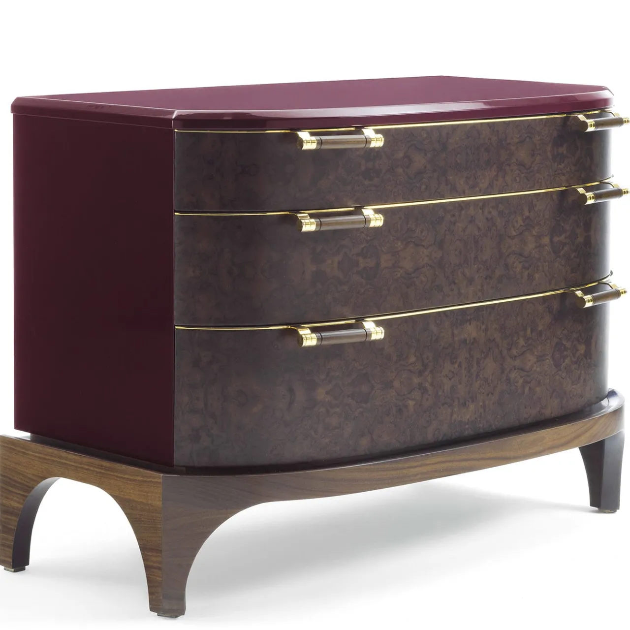 Cassettiera con base in noce e piano in legno laccato. Cassetti e maniglie in ottone e radica di noce.