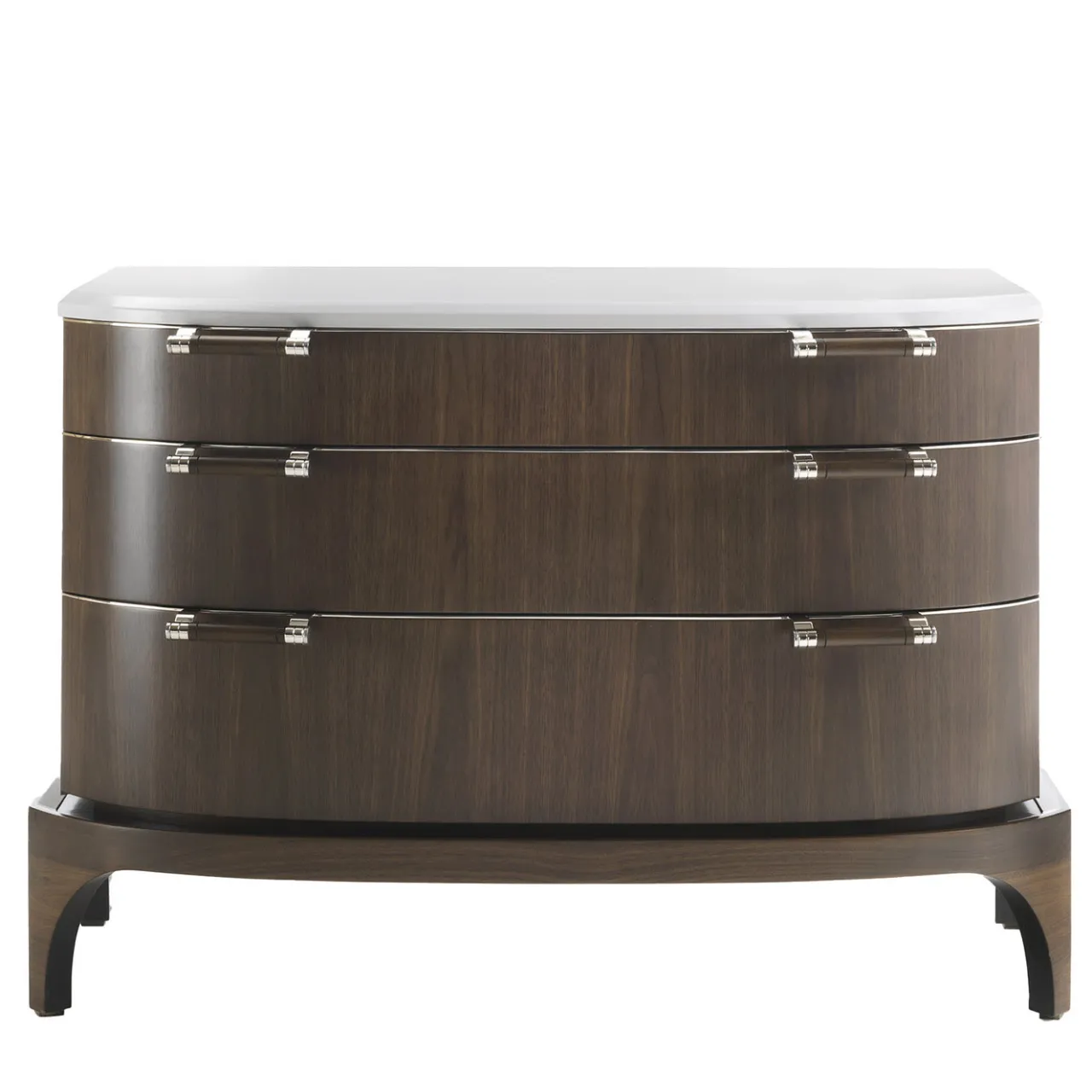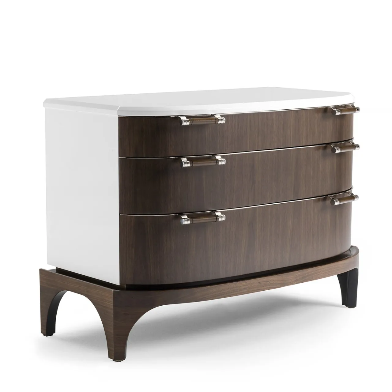 Perfetto complemento del comodino in noce Canaletto, questo splendido design presenta linee pulite e arrotondate di grande raffinatezza. Maestoso e versatile, questo comò ha un piano in legno laccato bianco ed è realizzato in noce Canaletto, disponibile anche in radica di noce. I tre cassetti sono dotati di maniglie in nichel, personalizzabili a scelta in ottone lucido; per maggiori informazioni, contattare il Concierge.