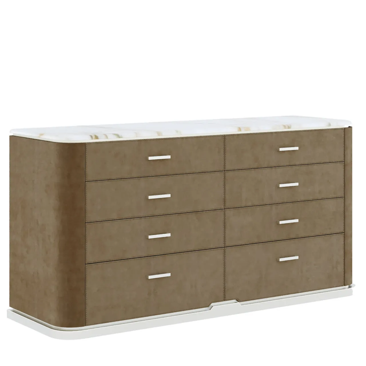 Cassettiera con struttura in legno. I frontali dei cassetti sono rivestiti in pelle Nabuk. Il piano è in marmo bianco Michelangelo e le maniglie sono in metallo con finitura champagne. Per ulteriori informazioni, contattare il Concierge. Questo pezzo fa parte della collezione Secret Shapes.
