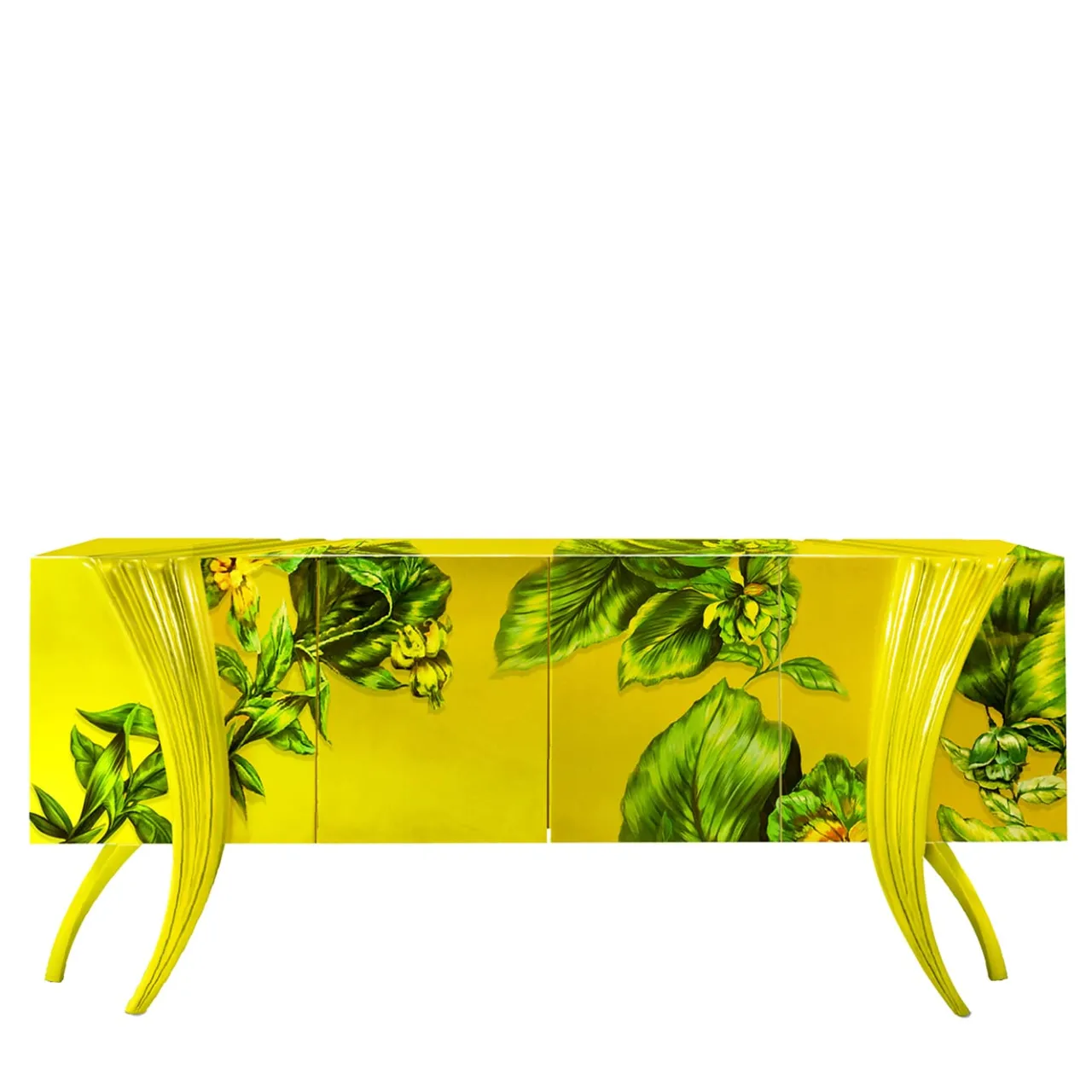 Carlo Rampazzi ha concepito questo progetto come uno scorcio di giardino botanico attualizzato in una credenza. L’ispirazione fitomorfa è rivelata dal disegno sinuoso e finemente intagliato delle gambe, che si armonizza con il motivo dei rami e delle foglie che si estendono lungo tutta la struttura in legno verniciato nei toni del verde e del giallo. Per maggiori dettagli sul tema botanico personalizzabile, consultare il Concierge.