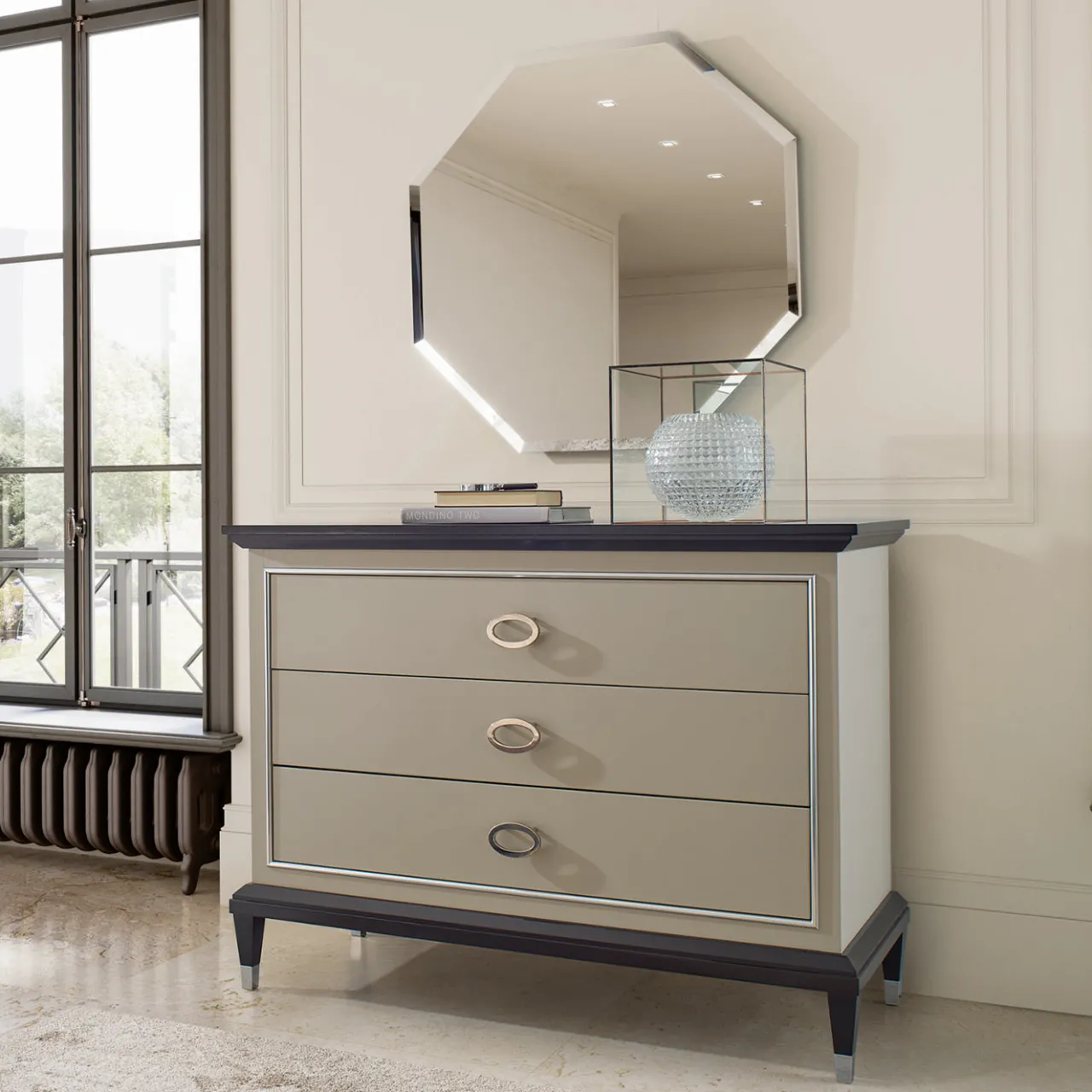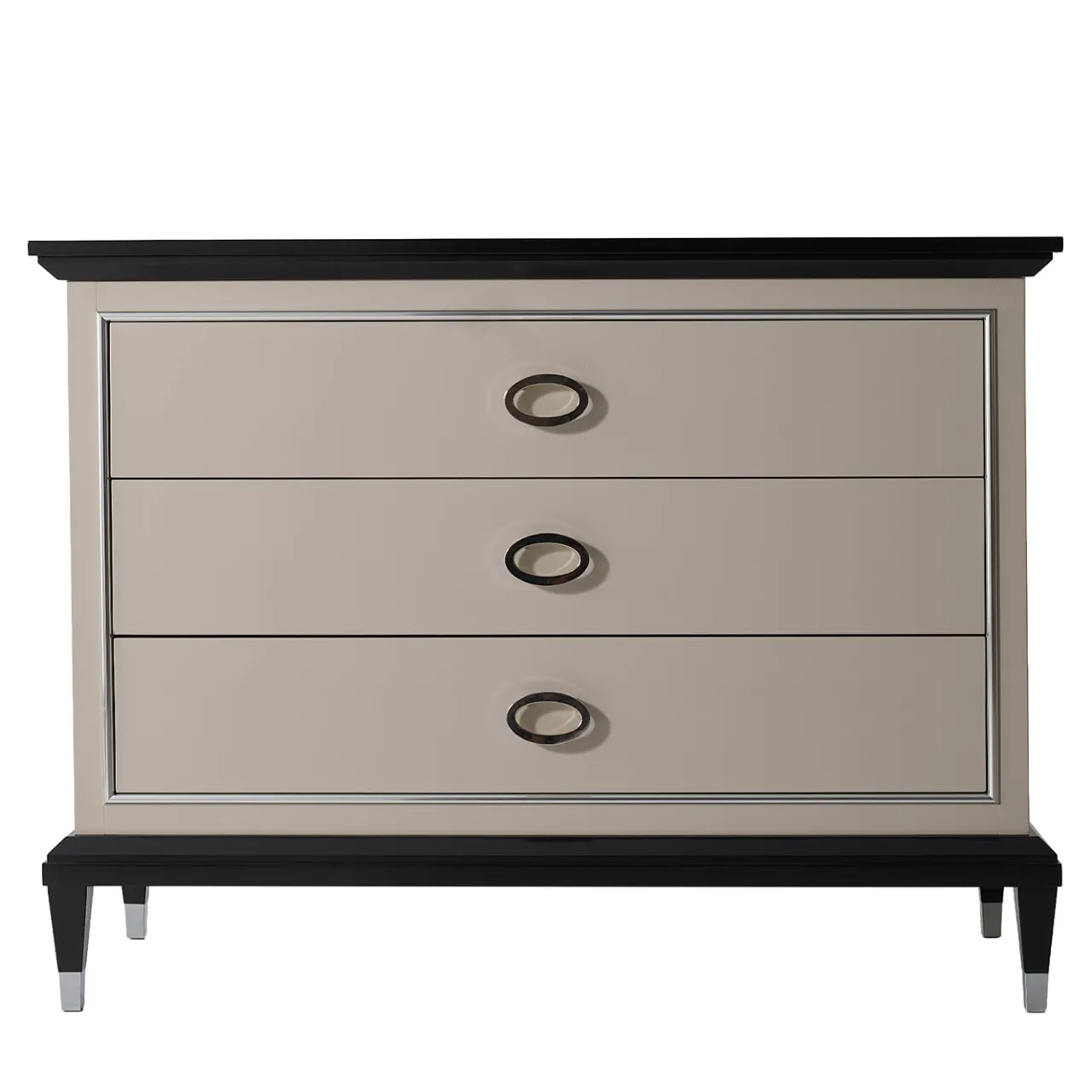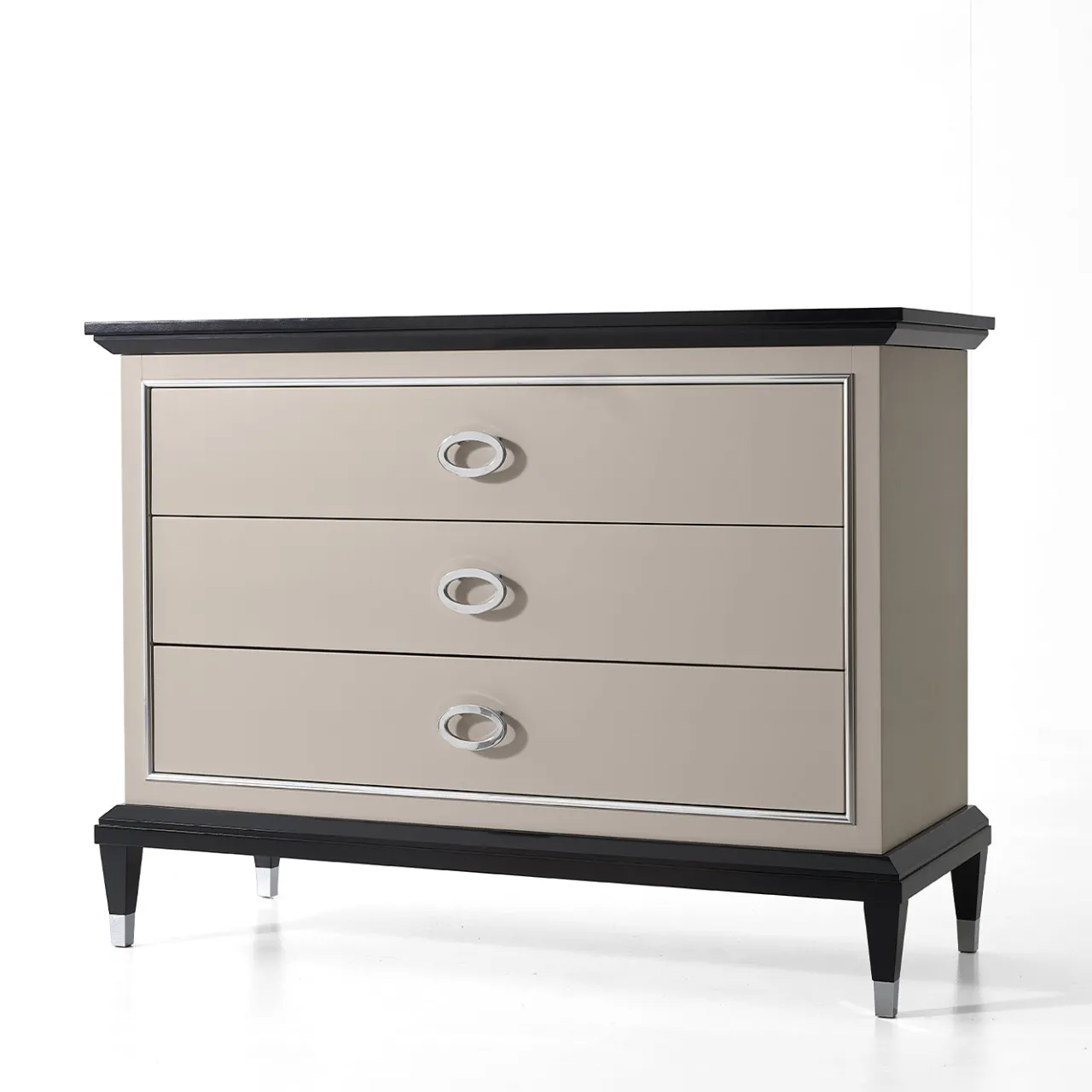 Il comò laccato grigio Penthouse presenta tre ampi cassetti con guide auto-chiudenti per un funzionamento fluido. La struttura centrale e le facciate dei cassetti sono finite in lacca, completate da eleganti maniglie, piedi e dettagli in cromo. Il suo design di medie dimensioni offre un equilibrio raffinato tra funzionalità ed eleganza contemporanea, rendendolo adatto a vari interni.